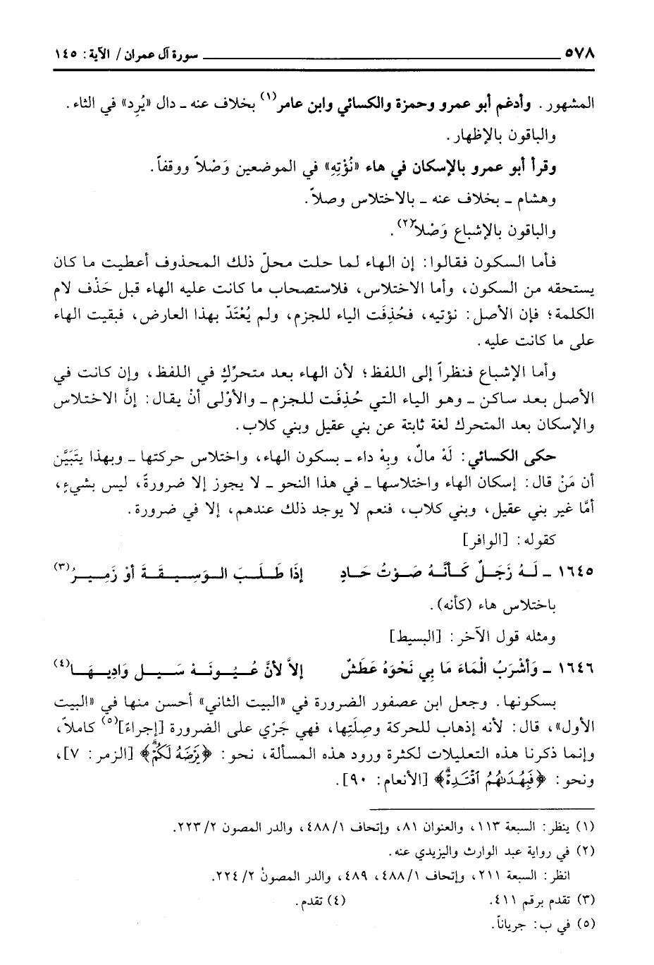 بسكونها. وجعل ابن عصفور الضرورة في «البيت الثاني» أحسن منها في «البيت الأول» ، قال: لأنه إذهاب للحركة وصِلَتِها، فهي جَرْي على الضرورة [إجراءً] كاملاً، وإنما ذكرنا هذه التعليلات لكثرة ورود هذه المسالة، نحو: {يَرْضَهُ لَكُمْ} [الزمر: 7] ، ونحو: {فَبِهُدَاهُمُ اقتده} [الأنعام: 90] .
