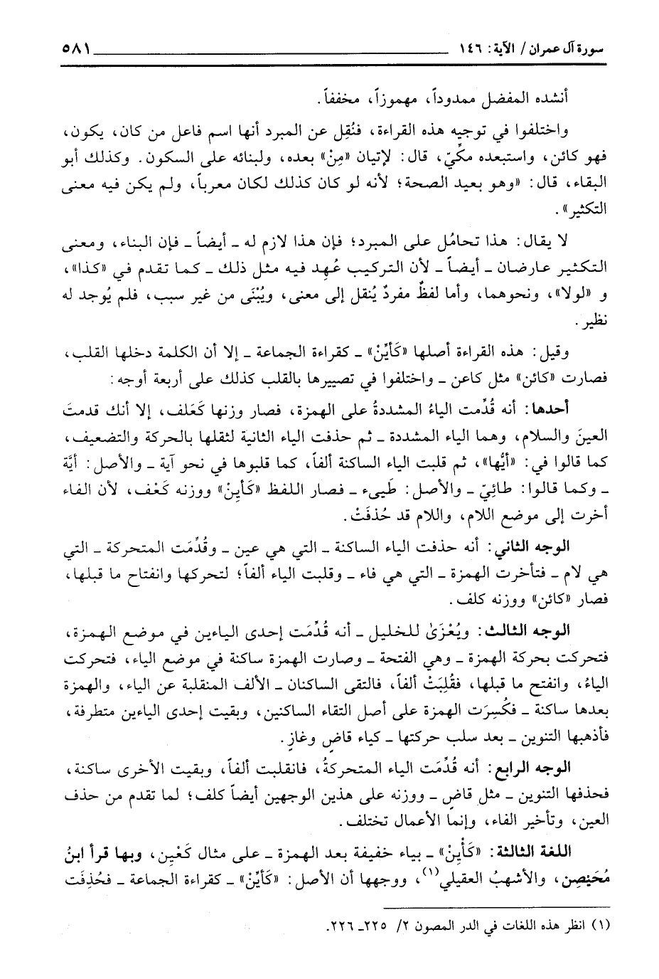 وقيل: هذه القراءة أصلها «كَأيِّنْ» - كقراءة الجماعة - إلا أن الكلمة دخلها القلب، فصارت «كائن» مثل كاعن - واختلفوا في تصييرها بالقلب كذلك على أربعة أوجه: