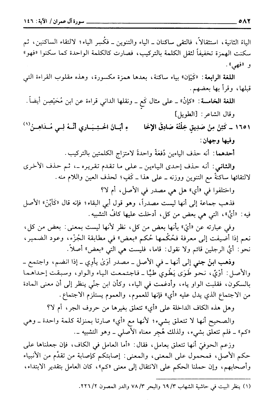 وفي عبارته عن «أيّ» بأنها بعض من كل، نظر لأنها ليست بمعنى: بعض من كل، نعم إذا أضيفت إلى معرفة فحُكْمها حُكم «بعض» في مطابقة الجُزْء، وعود الضمير، نحو: أيُّ الرجلين قائم ولا نقول: قاما، فليست هي التي «بعض» اصلاً.