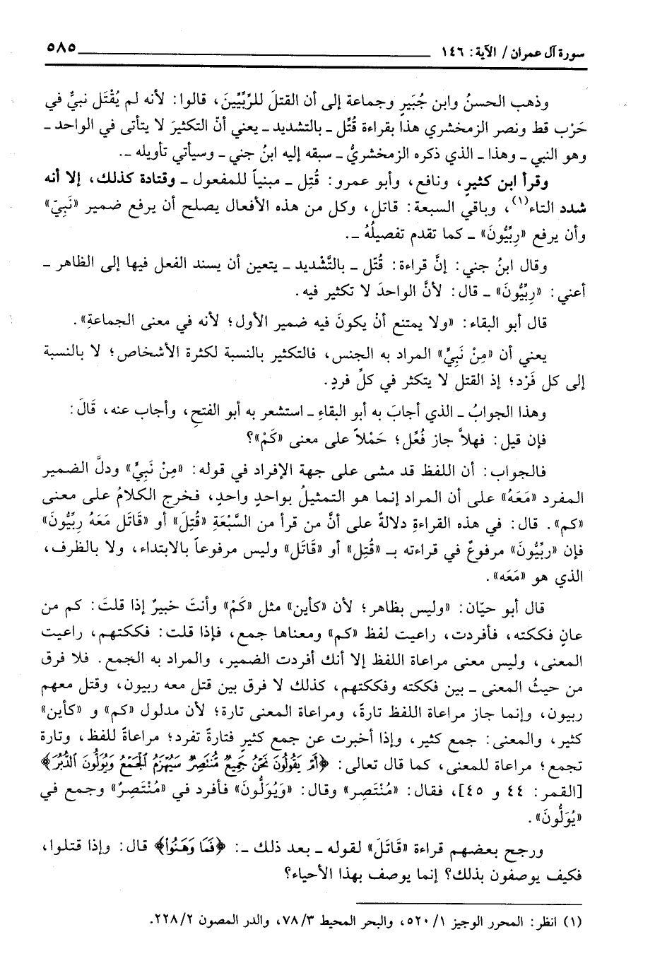 وذهب الحسنُ وابن جُبَيرٍ وجماعة إلى أن القتلَ للرِّبِّيِّينَ، قالوا: لأنه لم يُقْتَل نبيٌّ في حَرْب قط ونصر الزمخشري هذا بقراءة قُتِّل - بالتشديد - يعني أنّ التكثيرَ لا يتأتى في الواحد - وهو النبي - وهذا - الذي ذكره الزمخشريُّ - سبقه إليه ابنُ جني - وسيأتي تأويله -.