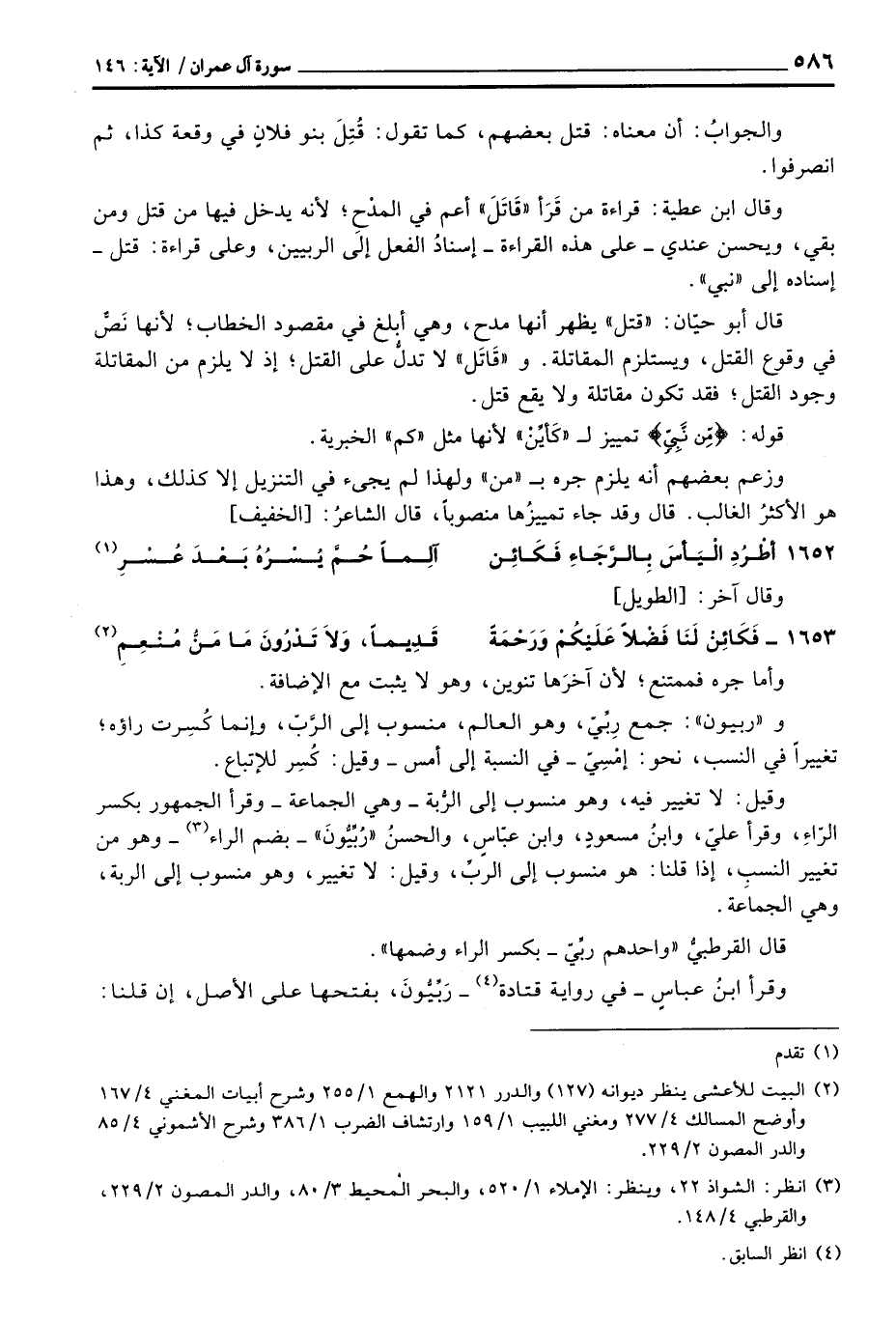 وقال ابن عطية: قراءة من قَرَأ» قَاتَلَ «أعم في المدْحِ؛ لأنه يدخل فيها من قتل ومن بقي، ويحسن عندي - على هذه القراءة - إسنادُ الفعل إلى الربيين، وعلى قراءة: قتل - إسناده إلى» نبي «.