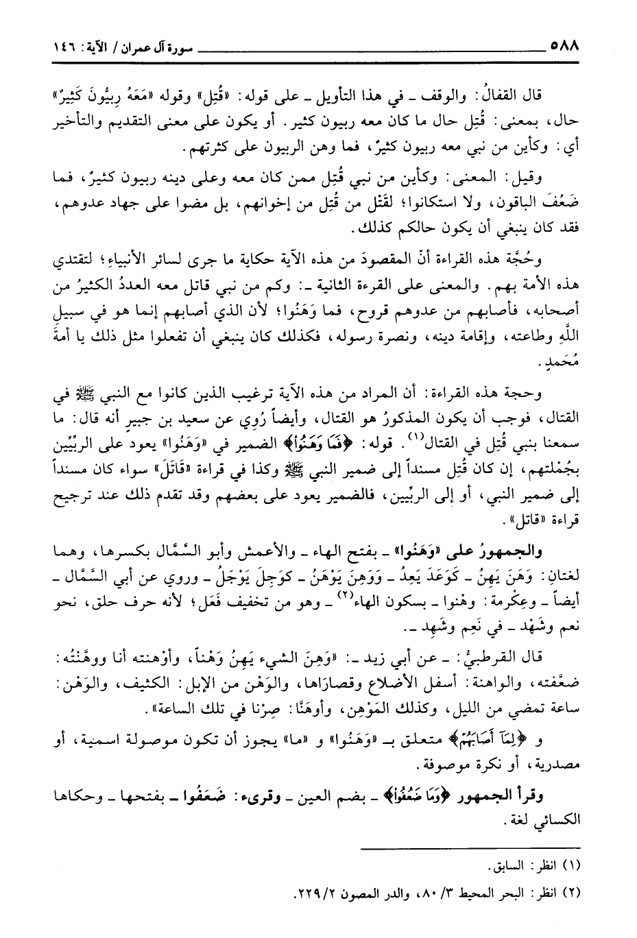 قال القفالُ: والوقف - في هذا التأويل - على قوله:» قُتِل «وقوله {مَعَهُ رِبيُّونَ كَثِيرٌ} حال، بمعى: قُتِل حال ما كان معه ربيون كثير. أو يكون على معنى التقديم والتأخير أي: وكأين من نبي معه ربيون كثيرٌ، فما وهن الربيون على كثرتهم.