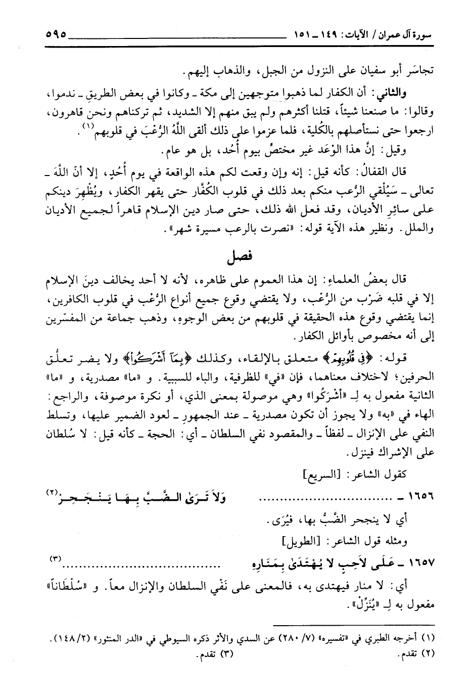 قوله: {فِي قُلُوبِهِمْ} [آل عمران: 156] متعلق بالإلقاء، وكذلك {بِمَآ أَشْرَكُواْ} ولا يضر تعلُّق الحرفين؛ لاختلاف معناهما، فإن «في» للظرفية؛ الباء للسببية. و «ما» مصدرية، و «ما» الثانية مفعول به لِ «أشْرَكُوا» وهي موصولة بمعنى الذي، أو نكرة موصوفة، والراجع: الهاء في «به» ولا يجوز أن تكون مصدرية - عند الجمهورِ - لعود الضمير عليها، وتسلط النفي على الإنزال - لفظاً - والمقصود نفي السلطان - أي: الحجة - كأنه قيل: لا سُلطان على الإشراك فينزل.