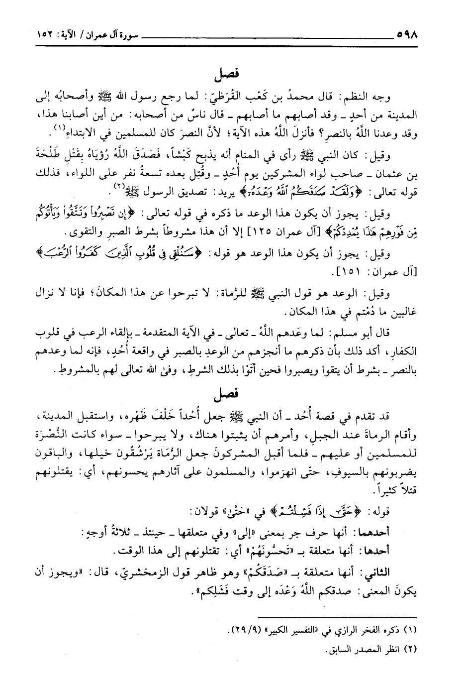 قال أبو مسلم: لما وعَدهم اللهُ - تعالى - في الآية المتقدمة - بإلقاء الرعب في قلوب الكفارِ، أكد ذلك بأن ذكرهم ما أنجزهم من الوعدِ بالصبر في واقعة أُحُدٍ، فإنه لما وعدهم بالنصر - بشرط أن يتقوا ويصبروا فحين أتَوْا بذلك الشرطِ، وفى الله تعالى لهم بالمشروطِ.