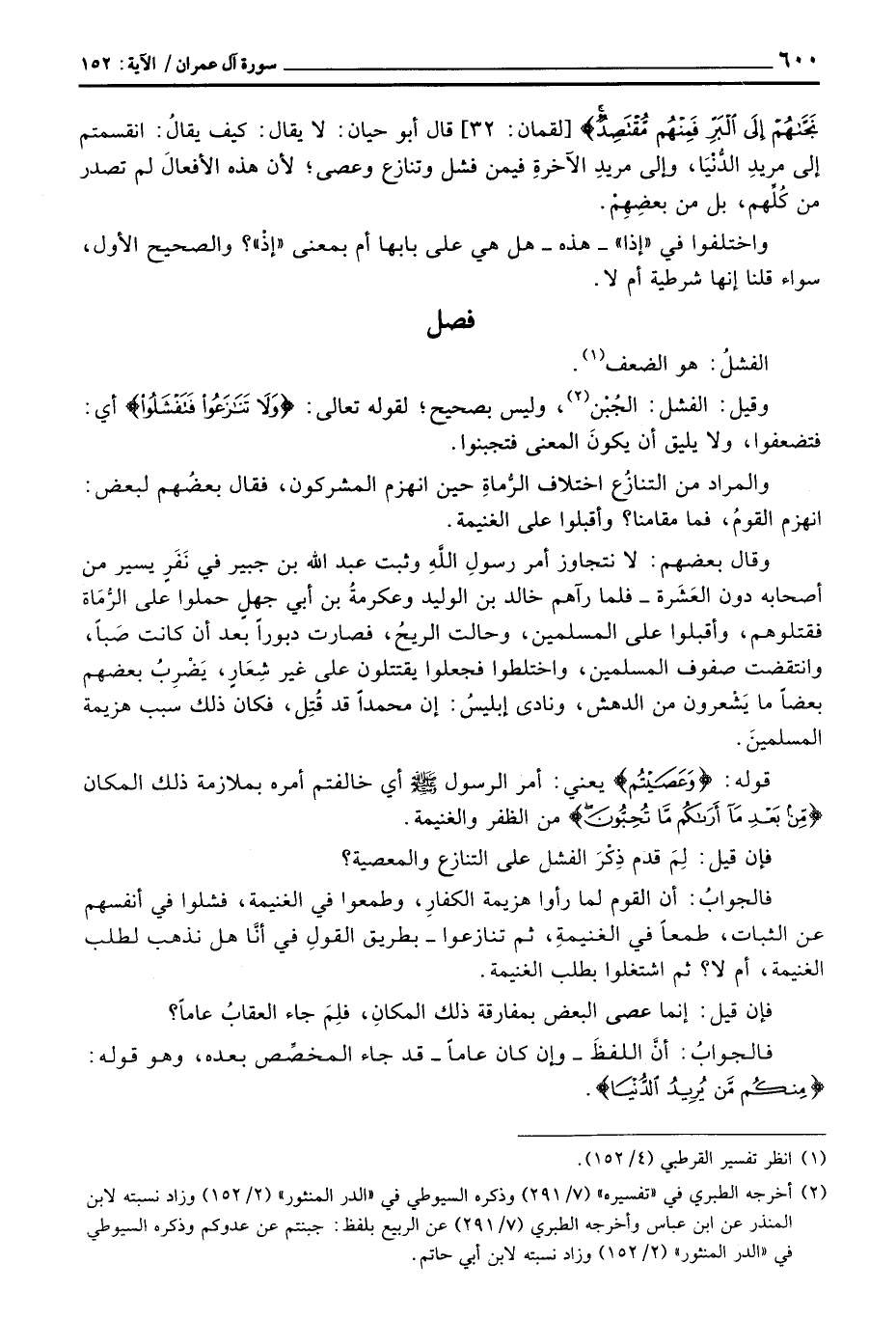 فالجوابُ: أن القوم لما رأوا هزيمة الكفارِ، وطمعوا في الغنيمة، فشلوا في أنفسهم عن الثبات، طمعاً من الغنيمةِ، ثم تنازعوا - بطريق القولِ في أنَّا هل نذهب لطلب الغنيمة، أم لا؟ ثم اشتغلوا بطلب الغنيمة.