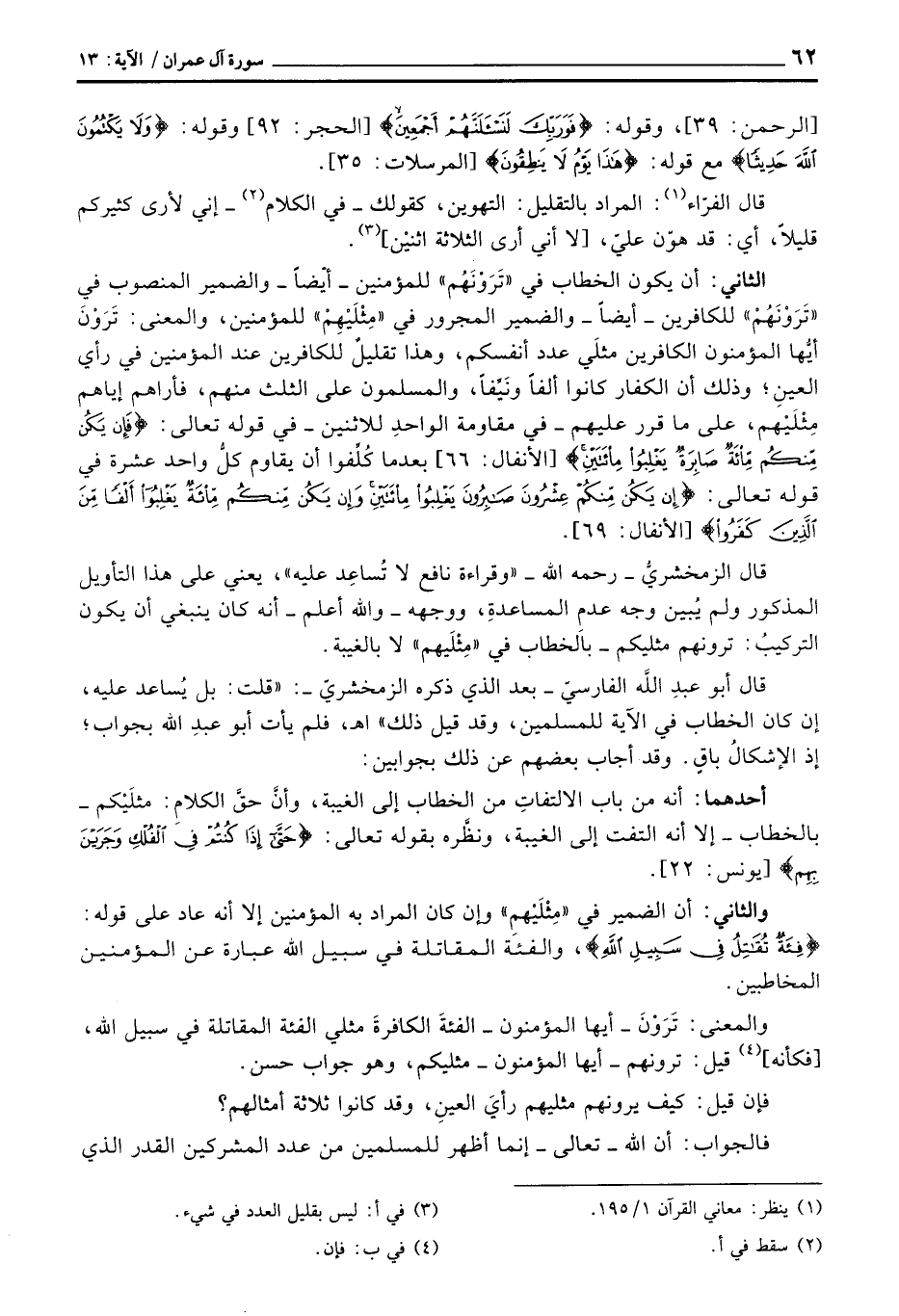 الثاني: أن يكون الخطاب في «تَرَوْنَهُم» للمؤمنين - أيضاً - والضمير المنصوب في «تَرَوْنَهُمْ» للكافرين - أيضاً - والضمير المجرور في «مِثْلَيْهِمْ» للمؤمنين، والمعنى: تَرَوْنَ أيُّها المؤمنون الكافرين مثلَي عدد أنفسكم، وهذا تقليلٌ للكافرين عند المؤمنين في رأي العينِ؛ وذلك أن الكفار كانوا ألفاً ونَيِّفاً، والمسلمون على الثلث منهم، فأراهم إياهم مِثْلَيْهم، على ما قرر عليهم - في مقاومة الواحدِ للاثنين - في قوله تعالى: {فَإِن يَكُنْ مِّنكُمْ مِّئَةٌ صَابِرَةٌ يَغْلِبُواْ مِئَتَيْنِ} [الأنفال: 66] بعدما كُلِّفوا أن يقاوم كلُّ واحد عشرة في قوله تعالى: {إِن يَكُن مِّنكُمْ عِشْرُونَ صَابِرُونَ يَغْلِبُواْ مِئَتَيْنِ وَإِن يَكُنْ مِّنكُمْ مِّئَةٌ يغلبوا أَلْفاً مِّنَ الذين كَفَرُواْ} [الأنفال: 65] .