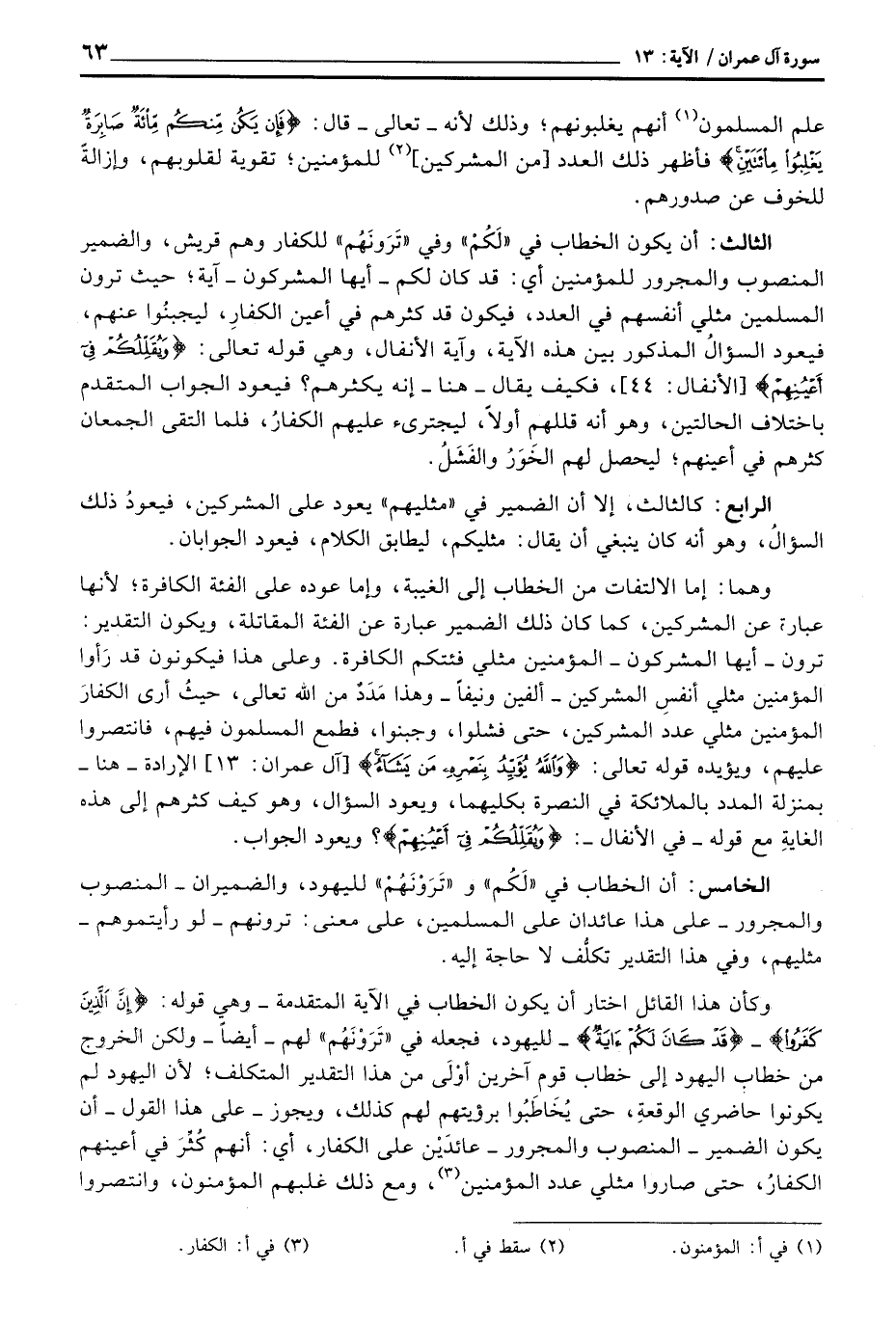 وهما: إما الالتفات من الخطاب إلى الغيبة، وإما عوده على الفئة الكافرة؛ لأنها عبارة عن المشركين، كما كان ذلك الضمير عبارة عن الفئة المقاتلة، ويكون التقدير: ترون - أيها المشركون - المؤمنين مثلي فئتكم الكافرة. وعلى هذا فيكونون قد رَأوا المؤمنين مثلي أنفسِ المشركين - ألفين ونيفاً - وهذا مَدَدٌ من الله تعالى، حيثُ أرى الكفارَ المؤمنين مثلي عدد المشركين، حتى فشلوا، وجبنوا، فطمع المسلمون فيهم، فانتصروا عليهم، ويؤيده قوله تعالى: {والله يُؤَيِّدُ بِنَصْرِهِ مَن يَشَآءُ} [آل عمران: 13] الإرادة - هنا - بمنزلة المدد بالملائكة في النصرة بكليهما، ويعود السؤال، وهو كيف كثرهم إلى هذه الغايةِ مع قوله - في الأنفال -: {وَيُقَلِّلُكُمْ في أَعْيُنِهِمْ} [الأنفال: 44] ؟ ويعود الجواب.