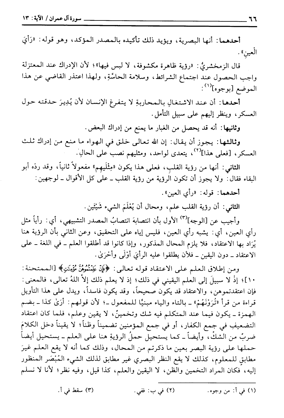 الثاني: أنها من رؤية القلبِ، فعلى هذا يكون «مِثْلَيهِم» مفعولاً ثانياً، وقد ردّه أبو البقاء فقال: ولا يجوز أن تكون الرؤية من رؤية القلب - على كل الأقوال - لوجهين: أحدهما: قوله: «رأي العين» .