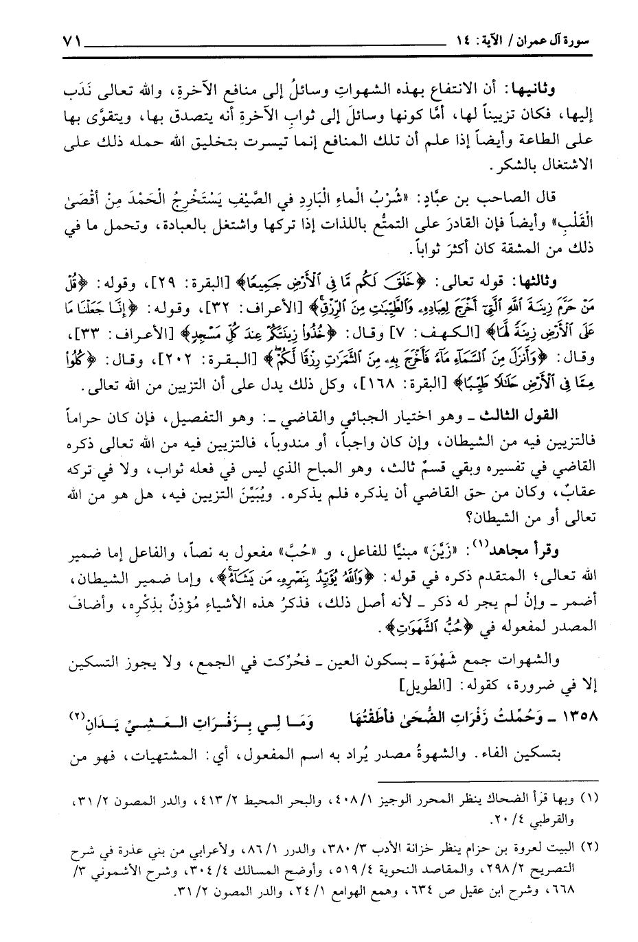 وثانيها: أن الانتفاع بهذه الشهواتِ وسائلُ إلى منافع الآخرةِ، والله تعالى نَدَب إليها، فكان تزييناً لها، أمَّا كونها وسائلَ إلى ثوابِ الآخرةِ أنه يتصدق بها، ويتقوَّى بها على الطاعة وأيضاً إذا علم أن تلك المنافع إنما تيسرت بتخليق الله حمله ذلك على الاتشغال بالشكر.