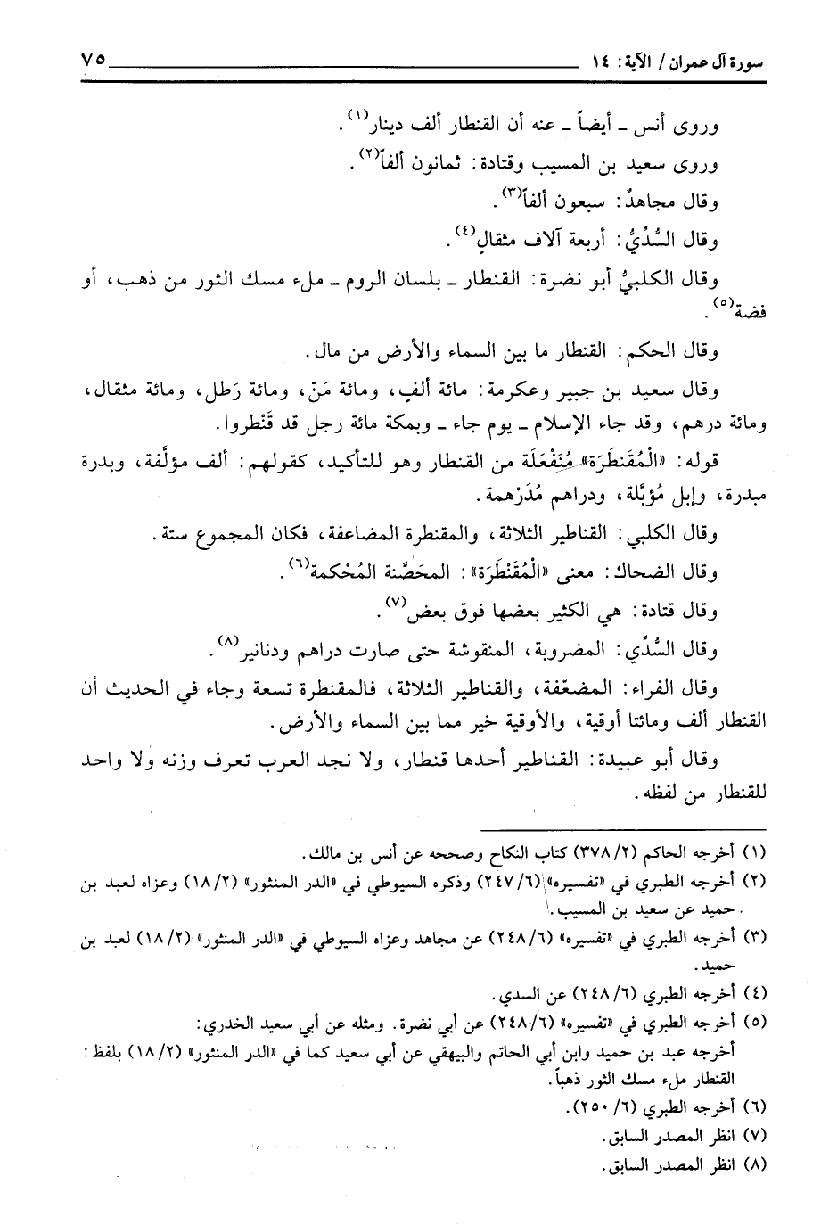 وقال سعيد بن جبير وعكرمة: مائة ألفٍ، ومائة مَنّ، ومائة رَطل، ومائة مثقال، ومائة درهم، وقد جاء الإسلام - يوم جاء - وبمكة مائة رجل قد قَنْطروا.
