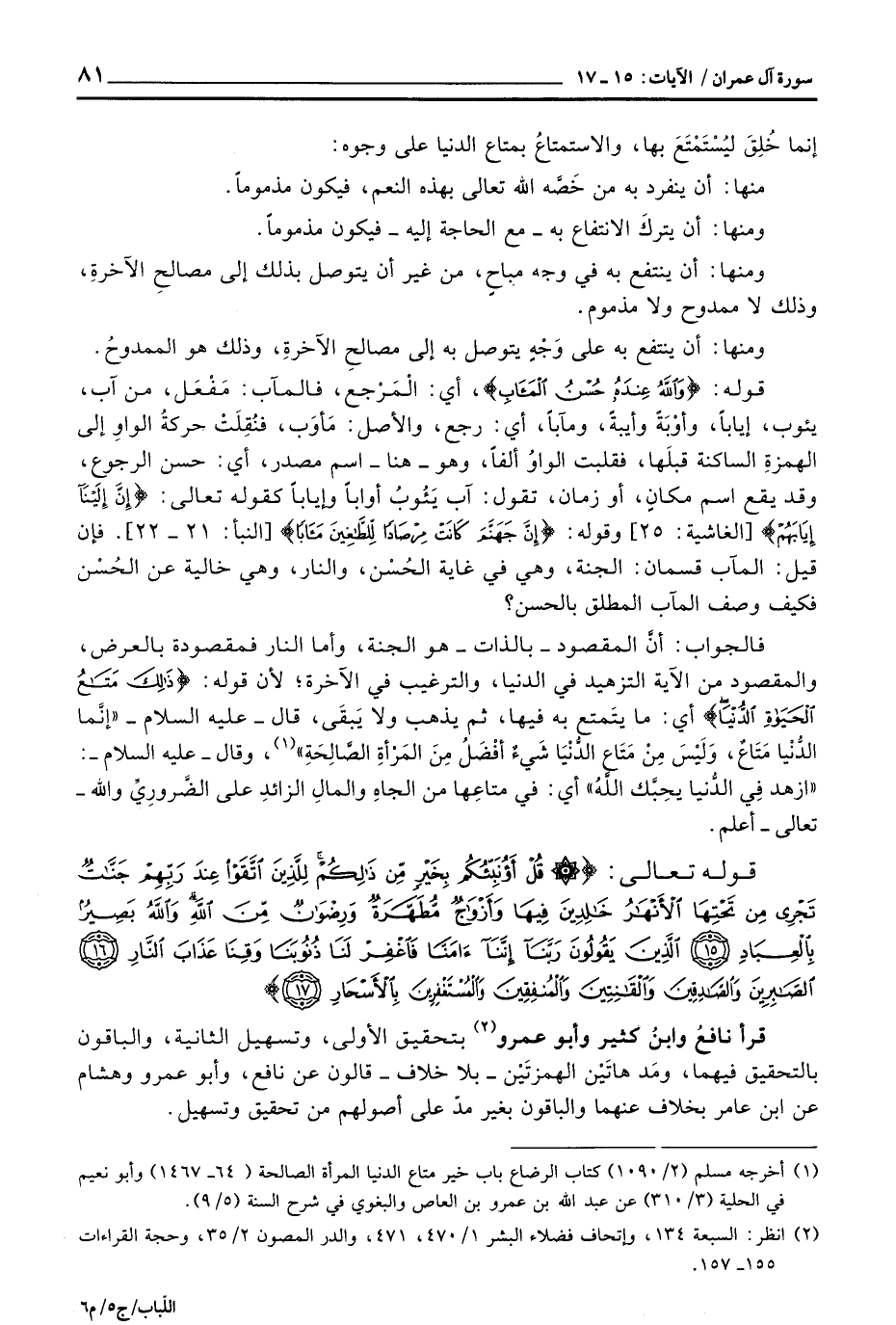 فالجواب: أنَّ المقصود - بالذات - هو الجنة، وأما النار فمقصودة بالعرض، والمقصود من الآية التزهيد في الدنيا، والترغيب في الآخرة؛ لأن قوله: {ذلك مَتَاعُ الحياة الدنيا} أي: ما يتَمتع به فيها، ثم يذهب ولا يَبقَى، قال - عليه السلام -: «ازهد فِي الدُّنيا يحِبَّك اللهُ» أي: في متاعِها من الجاهِ والمالِ الزائدِ على الضَّرورِيِّ والله تعالى - أعلم.