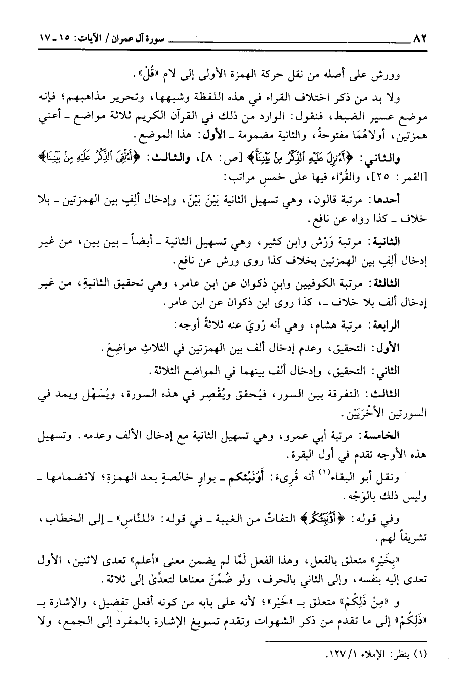 ولا بد من ذكر اختلاف القراء في هذه اللفظة وشبهها، وتحرير مذاهبهم؛ فإنه موضع عسير الضبط، فنقول: الوارد من ذلك في القرآن الكريم ثلاثة مواضع - أعني همزتين، أولاهُمَا مفتوحةُ، والثانية مضمومة - الأول: هذا الموضع.