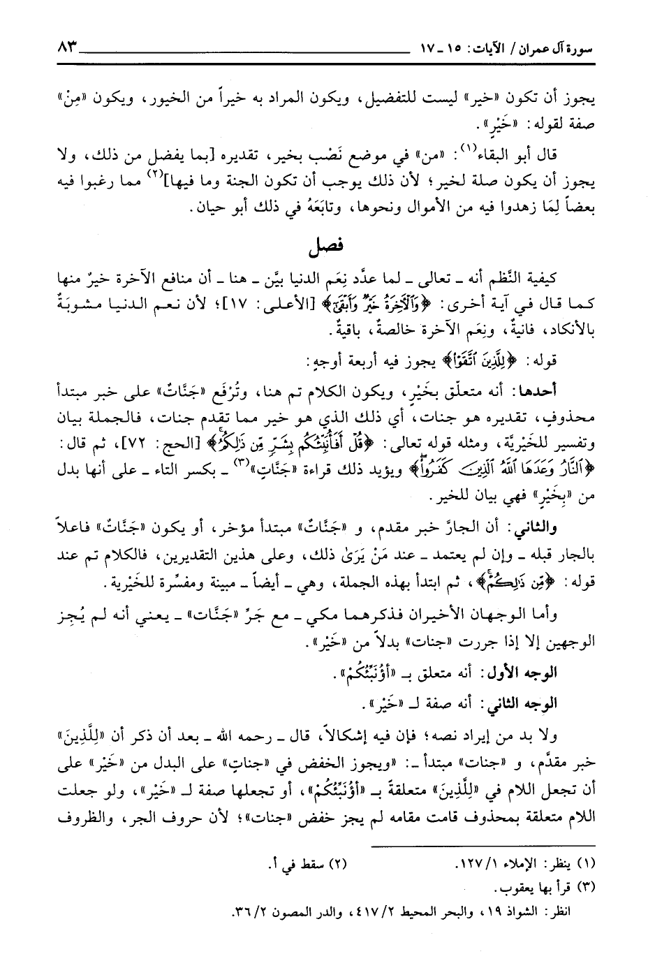 ولا بد من إيراد نصه؛ فإن فيه غشكالاً، قال - رَحِمَهُ اللَّهُ - بعد أن ذكر أن «لِلَّذِينَ» خبر مقدَّم، و «جنات» مبتدأ -: «ويجوز الخفض في» جناتٍ «على البدل من» خَيْر «على أن تجعل اللام في» لِلَّذِينَ «متعلقةً ب» أؤُنَبِّئُكُمْ «، أو تجعلها صفة ل» خَيْر «، ولو جعلت اللام متعلقة بمحذوف قامت مقامه لم يجز خفض» جنات «؛ لأن حروف الجر، والظروف