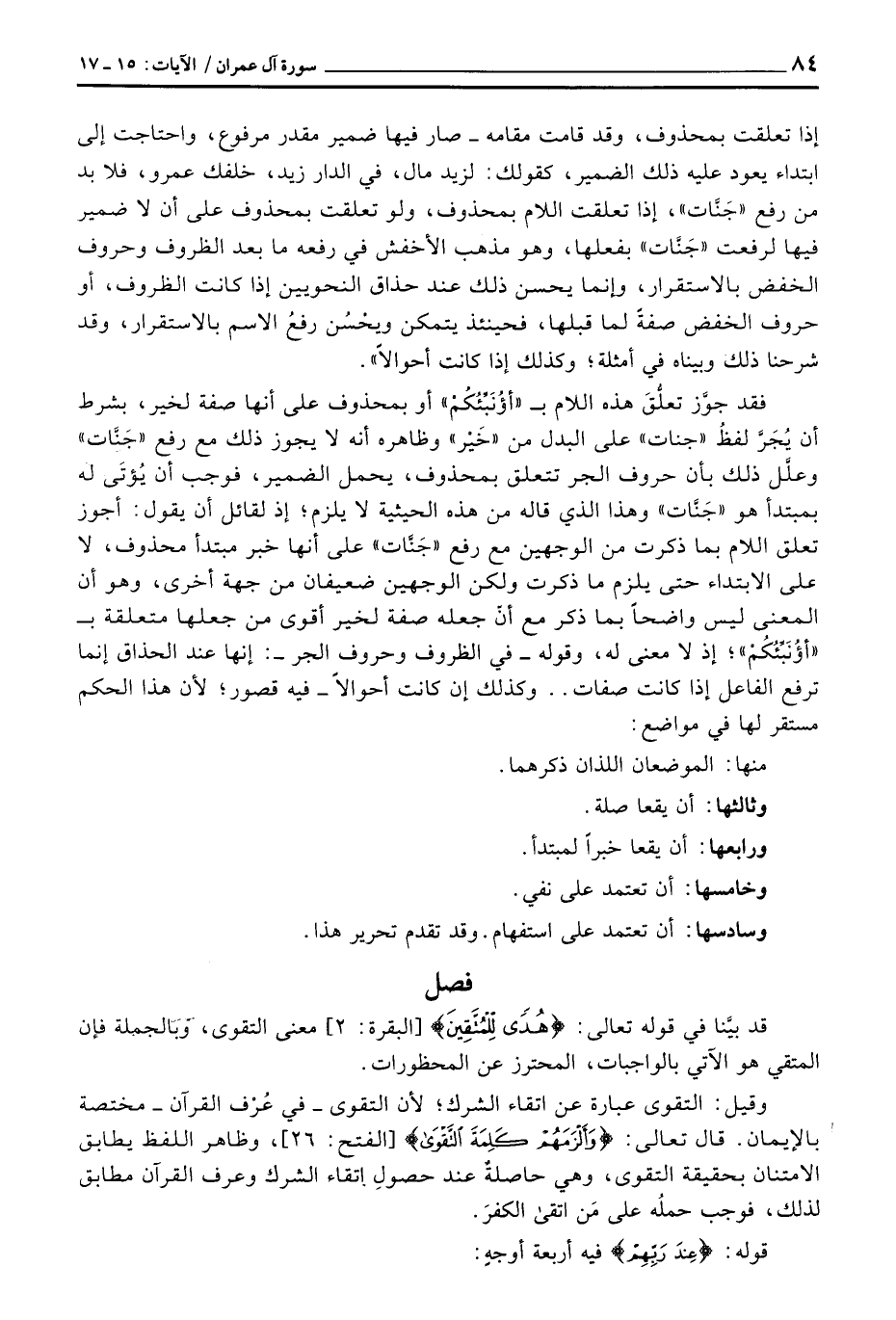 فقد جوَّز تعلُّقَ هذه اللام ب «أؤُنَبِّئُكُمْ» أو بمحذوف على أنها صفة لخير، بشرط أن يُجَرَّ لفظُ «جنات» على البدل من «خَيْر» وظاهره أنه لا يجوز ذلك مع رفع «جَنَّات» وعلَّل ذلك بأن حروف الجر تتعلق بمحذوف، يحمل الضمير، فوجب أن يُؤتَى له بمبتدأ هو «جَنَّات» وهذا الذي قاله من هذه الحيثية لا يلزم؛ إذ لقائل أن يقول: أجوز تعلق اللام بما ذكرت من الوجهين مع رفع «جَنَّات» على أنها خبر مبتدأ محذوف، لا على الابتداء حتى يلزم ما ذكرت ولكن الوجهين ضعيفان من جهة أخرى، وهو أن المعنى ليس واضحاً بما ذكر مع أنّ جعله صفة لخير أقوى من جعلها متعلقة ب «أؤُنَبِّئُكُمْ» ؛ إذ لا معنى له، وقوله - في الظروف وحروف الجر -: إنها عند الحذاق إنما ترفع الفاعل إذا كانت صفات. . وكذلك إن كانت أحوالاً - فيه قصور؛ لأن هذا الحكم مستقر لها في مواضع: