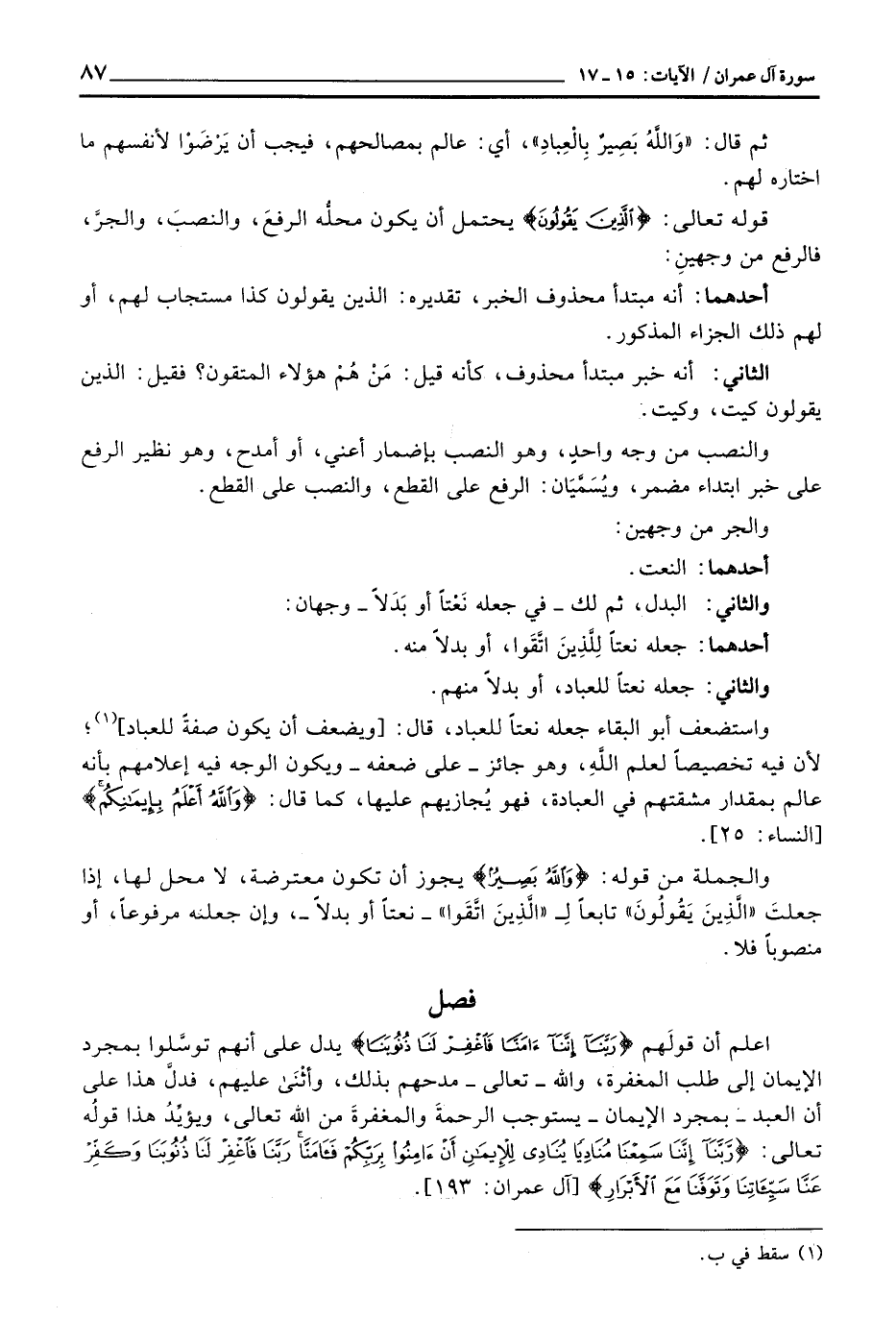 واستضعف ابو البقاء جعله نعتاً للعباد، قال: [ويضعف أن يكون صفةً للعباد] ؛ لأن فيه تخصيصاً لعلم اللهِ، وهو جائز - على ضعفه - ويكون الوجه فيه إعلامهم بأنه عالم بمقدار مشقتهم في العبادة، فهو يُجازيهم عليها، كما قال: {والله أَعْلَمُ بِإِيمَانِكُم} [النساء: 25] .