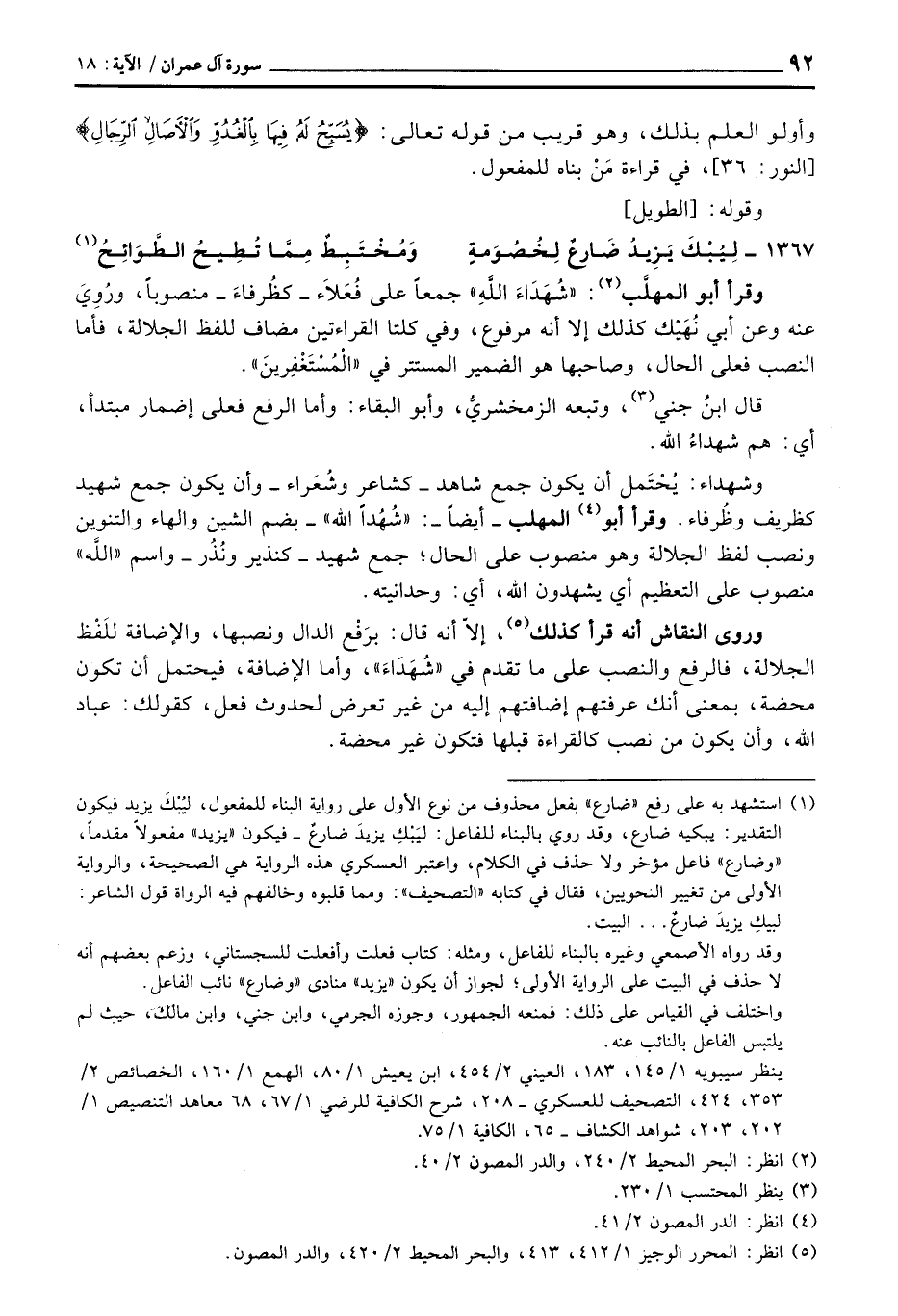 وشهداء: يُحْتَمل أن يكون جمع شاهد - كشاعر وشُعَراء - وأن يكون جمع شهيد كظريف وظُرفاء. وقرأ أبو المهلب - أيضاً -: «شُهُداً الله» - بضم الشين والهاء والتنوين ونصب لفظ الجلالة وهو منصوب على الحال؛ جمع شهيد - كنذير ونُذُر - واسم «الله» منصوب على التعظيم أي يشهدون الله، أي: وحدانيته.