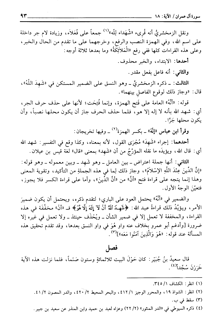 قوله: «أنَّهُ» العامة على فَتح الهمزة، وإنما فُتِحَت؛ لأنها على حذف حرف الجر، أي: شهد الله بأنه لا إله إلا هو، فلما حذف الحرف جاز أن يكون محلها نصباً، وأن يكون محلها جَرًّا.