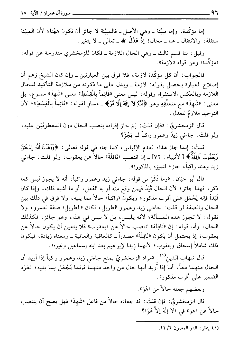 قال أبو حيّان: «وما ذَكَرَ من قوله: جاءني زيد وعمرو راكباً، أنه لا يجوز ليس كما ذكر، فهذا جائز؛ لأن الحال قَيْدٌ فيمن وقع منه أو به الفعل، أو ما أشبه ذلك، وإذا كان قَيْداً فإنه يُحْمَل على أقرب مذكور؛ ويكون» راكباً «حالاً مما يليه، ولا فرق في ذلك بين الحال والصفة لو قلت: جاءني زيد وعمرو الطويل، لكان» الطويل «صفة لعمرو، ولا تقول: لا تجوز هذه المسألة؛ لأنه يلبس، بل لا لبس في هذا، وهو جائز، فكذلك الحال، وأما قوله: إن» نَافِلَة «انتصب حالاً عن» يعقوب «فلا يتعين أن يكون حالاً عن يعقوب؛ إذ يحتمل أن يكون» نَافِلَةً «مصدراً - كالعاقبة والعافية - ومعناه زيادة، فيكون ذلك شاملاً إسحاق ويعقوب؛ لأنهما زِيدا لإبراهيم بعد ابنه إسماعيل وغيره» .