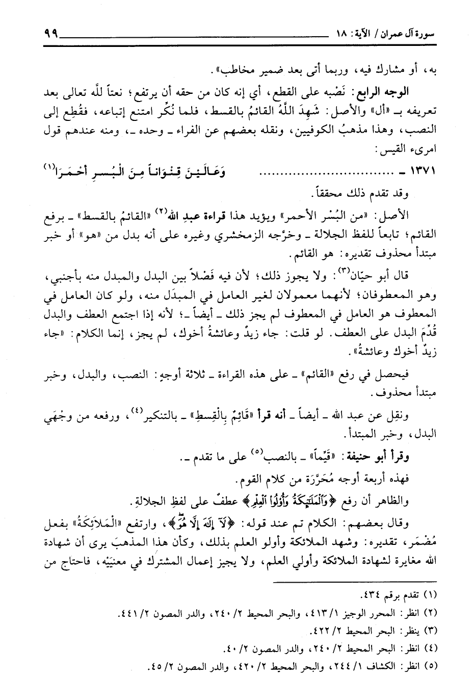 الأصل: «من البُسْر الأحمر» ويؤيد هذا قراءة عبدِ الله «القائمُ بالقسط» - برفع القائم؛ تابعاً للفظ الجلالة - وخرَّجه الزمخشري وغيره على أنه بدل من «هو» أو خبر مبتدأ محذوف تقديره: هو القائم.
