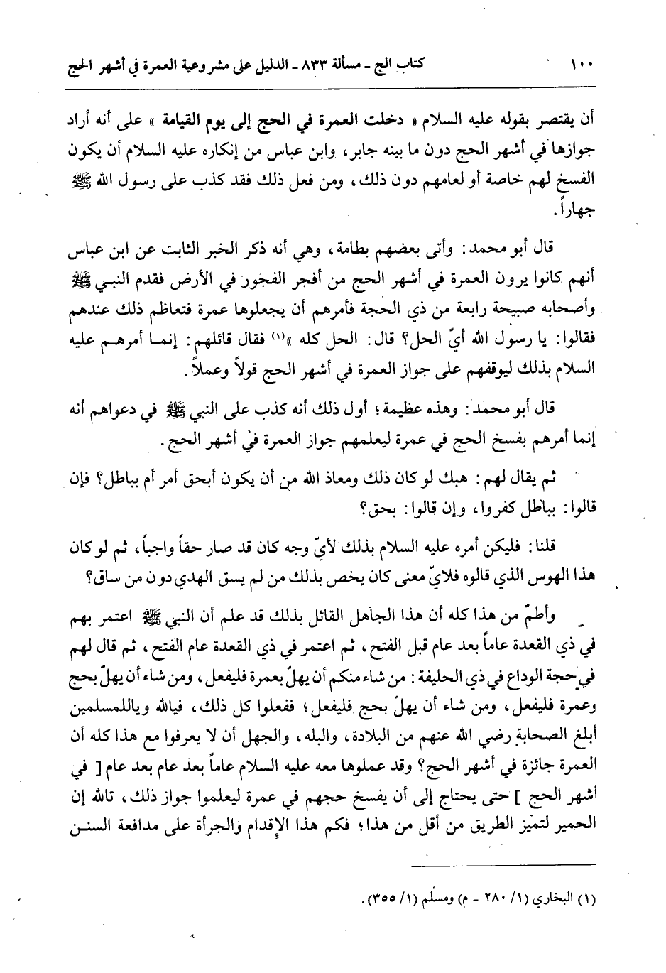 ثُمَّ يُقَالُ لَهُمْ: هَبْكَ لَوْ كَانَ ذَلِكَ وَمَعَاذَ اللَّهِ مِنْ أَنْ يَكُونَ أَبِحَقِّ أَمْرٍ أَمْ بِبَاطِلٍ؟ فَإِنْ قَالُوا: بِبَاطِلٍ كَفَرُوا، وَإِنْ قَالُوا: بِحَقٍّ؟ قُلْنَا: فَلْيَكُنْ أَمْرُهُ - عَلَيْهِ السَّلَامُ - بِذَلِكَ لِأَيِّ وَجْهٍ كَانَ قَدْ صَارَ حَقًّا وَاجِبًا، ثُمَّ لَوْ كَانَ هَذَا الْهَوَسُ الَّذِي قَالُوهُ فَلِأَيِّ مَعْنًى كَانَ يَخُصُّ بِذَلِكَ مَنْ لَمْ يَسُقْ الْهَدْيَ دُونَ مَنْ سَاقَ؟ وَأَطَمُّ مِنْ هَذَا كُلِّهِ أَنَّ هَذَا الْجَاهِلَ الْقَائِلَ بِذَلِكَ قَدْ عَلِمَ أَنَّ النَّبِيَّ - صَلَّى اللَّهُ عَلَيْهِ وَسَلَّمَ - اعْتَمَرَ بِهِمْ فِي ذِي الْقَعْدَةِ عَامًا بَعْدَ عَامٍ قَبْلَ الْفَتْحِ، ثُمَّ اعْتَمَرَ فِي ذِي الْقَعْدَةِ عَامَ الْفَتْحِ، ثُمَّ قَالَ لَهُمْ فِي حَجَّةِ الْوَدَاعِ فِي ذِي الْحُلَيْفَةِ: مَنْ شَاءَ مِنْكُمْ أَنْ يُهِلَّ بِعُمْرَةٍ فَلْيَفْعَلْ، وَمَنْ شَاءَ أَنْ يُهِلَّ بِحَجٍّ وَعُمْرَةٍ فَلْيَفْعَلْ، وَمَنْ شَاءَ أَنْ يُهِلَّ بِحَجٍّ فَلْيَفْعَلْ؛ فَفَعَلُوا كُلَّ ذَلِكَ، فَيَا لِلَّهِ وَيَا لِلْمُسْلِمِينَ أَبَلَغَ الصَّحَابَةُ - رَضِيَ اللَّهُ عَنْهُمْ - مِنْ الْبَلَادَةِ، وَالْبَلَهِ، وَالْجَهْلِ أَنْ لَا يَعْرِفُوا مَعَ هَذَا كُلِّهِ أَنَّ الْعُمْرَةَ جَائِزَةٌ فِي أَشْهُرِ الْحَجِّ؟ وَقَدْ عَمِلُوهَا مَعَهُ - عَلَيْهِ السَّلَامُ - عَامًا بَعْدَ عَامٍ بَعْدَ عَامٍ [فِي أَشْهُرِ الْحَجِّ] حَتَّى يَحْتَاجَ إلَى أَنْ يَفْسَخَ حَجَّهُمْ فِي عُمْرَةٍ لِيَعْلَمُوا جَوَازَ ذَلِكَ، تَاللَّهِ إنَّ الْحَمِيرَ لِتُمَيِّزَ الطَّرِيقَ مِنْ أَقَلَّ مِنْ هَذَا؛ فَكَمْ هَذَا الْإِقْدَامُ وَالْجُرْأَةُ عَلَى مُدَافَعَةِ السُّنَنِ