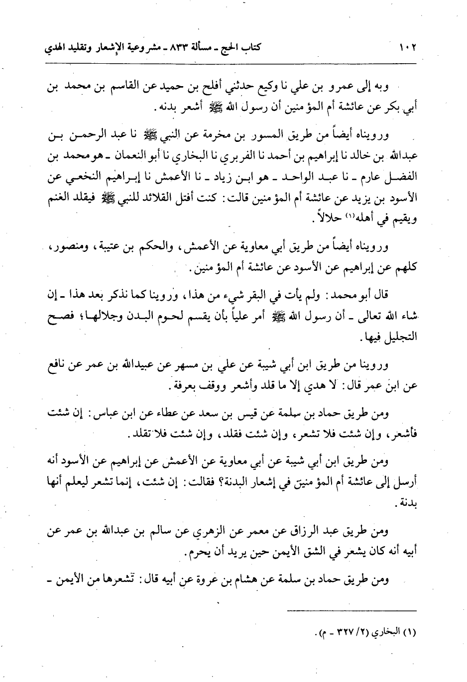وَبِهِ إلَى عَمْرِو بْنِ عَلِيٍّ نَا وَكِيعٌ حَدَّثَنِي أَفْلَحُ بْنُ حُمَيْدٍ عَنْ الْقَاسِمِ بْنِ مُحَمَّدِ بْنِ أَبِي بَكْرٍ عَنْ عَائِشَةَ أُمِّ الْمُؤْمِنِينَ «أَنَّ رَسُولَ اللَّهِ - صَلَّى اللَّهُ عَلَيْهِ وَسَلَّمَ - أَشْعَرَ بُدْنَهُ» .