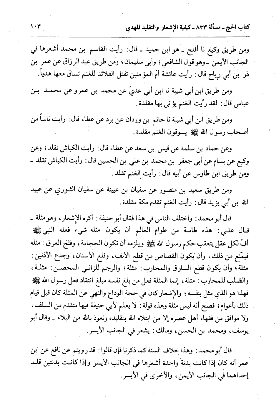 قَالَ أَبُو مُحَمَّدٍ: وَاخْتَلَفَ النَّاسُ فِي هَذَا فَقَالَ أَبُو حَنِيفَةَ: أَكْرَهُ الْإِشْعَارَ، وَهُوَ مُثْلَةٌ - قَالَ عَلِيٌّ: هَذِهِ طَامَّةٌ مِنْ طَوَامِّ الْعَالَمِ أَنْ يَكُونَ مِثْلُهُ شَيْءٍ فَعَلَهُ النَّبِيُّ - صَلَّى اللَّهُ عَلَيْهِ وَسَلَّمَ - أُفٍّ لِكُلِّ عَقْلٍ يَتَعَقَّبُ - حُكْمَ رَسُولِ اللَّهِ - صَلَّى اللَّهُ عَلَيْهِ وَسَلَّمَ - وَيَلْزَمُهُ أَنْ تَكُونَ الْحِجَامَةُ، وَفَتْحُ الْعِرْقِ: مِثْلَهُ فَيُمْنَعُ مِنْ ذَلِكَ، وَأَنْ يَكُونَ الْقِصَاصُ مِنْ قَطْعِ الْأَنْفِ، وَقَلْعِ الْأَسْنَانِ، وَجَدْعِ الْأُذُنَيْنِ: مُثْلَةٌ؛ وَأَنْ يَكُونَ قَطْعُ السَّارِقِ وَالْمُحَارِبِ: مُثْلَةً؛ وَالرَّجْمُ لِلزَّانِي الْمُحْصَنِ: مُثْلَةً، وَالصَّلْبُ لِلْمُحَارِبِ: مُثْلَةً، إنَّمَا الْمُثْلَةُ فِعْلُ مَنْ بَلَّغَ نَفْسَهُ مَبْلَغَ انْتِقَادِ فِعْلِ رَسُولِ اللَّهِ - صَلَّى اللَّهُ عَلَيْهِ وَسَلَّمَ - فَهَذَا هُوَ الَّذِي مَثَّلَ بِنَفْسِهِ؛ وَالْإِشْعَارُ كَانَ فِي حَجَّةِ الْوَدَاعِ وَالنَّهْيُ عَنْ الْمُثْلَةِ كَانَ قَبْلَ قِيَامِ ذَلِكَ بِأَعْوَامٍ؛ فَصَحَّ أَنَّهُ لَيْسَ مُثْلَةً وَهَذِهِ قَوْلَةٌ: لَا يُعْلَمُ لِأَبِي حَنِيفَةَ فِيهَا مُتَقَدِّمٌ مِنْ السَّلَفِ، وَلَا مُوَافِقٌ مِنْ فُقَهَاءِ أَهْلِ عَصْرِهِ إلَّا مَنْ ابْتَلَاهُ اللَّهُ بِتَقْلِيدِهِ وَنَعُوذُ بِاَللَّهِ مِنْ الْبَلَاءِ - وَقَالَ أَبُو يُوسُفَ، وَمُحَمَّدُ بْنُ الْحَسَنِ، وَمَالِكٌ: يُشْعِرُ فِي الْجَانِبِ الْأَيْسَرِ.