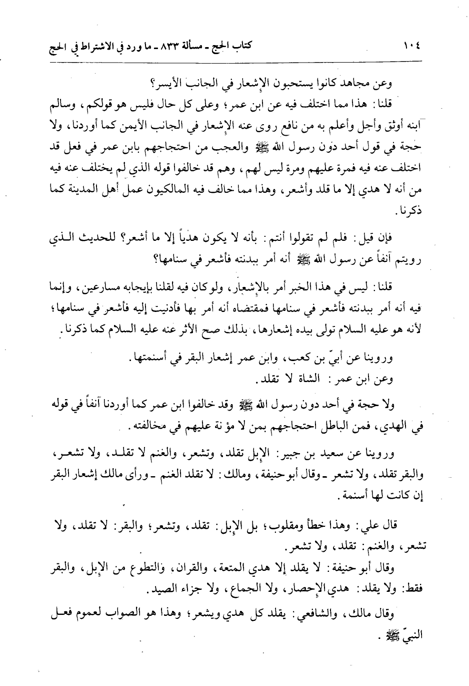 قَالَ عَلِيٌّ: وَهَذَا خَطَأٌ وَمَقْلُوبٌ؛ بَلْ الْإِبِلُ: تُقَلَّدُ، وَتُشْعَرُ؛ وَالْبَقَرُ: لَا تُقَلَّدُ، وَلَا تُشْعَرُ، وَالْغَنَمُ: تُقَلَّدُ، وَلَا تُشْعَرُ.