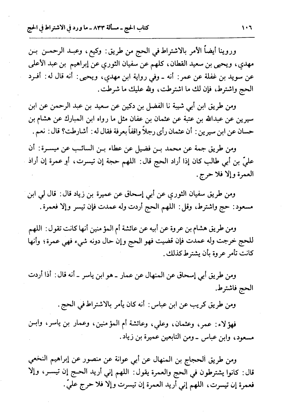 وَمِنْ طَرِيقِ الْحَجَّاجِ بْنِ الْمِنْهَالِ عَنْ أَبِي عَوَانَةَ عَنْ مَنْصُورٍ عَنْ إبْرَاهِيمَ النَّخَعِيِّ قَالَ: كَانُوا يَشْتَرِطُونَ فِي الْحَجِّ وَالْعُمْرَةِ يَقُولُ: اللَّهُمَّ إنِّي أُرِيدُ الْحَجَّ إنْ تَيَسَّرَ، وَإِلَّا فَعُمْرَةٌ إنْ تَيَسَّرَتْ، اللَّهُمَّ إنِّي أُرِيدُ الْعُمْرَةَ إنْ تَيَسَّرَتْ وَإِلَّا فَلَا حَرَجَ عَلَيَّ.
