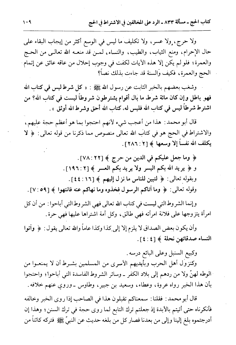 قَالَ أَبُو مُحَمَّدٍ: هَذَا مِنْ أَعْجَبْ شَيْءٍ لِأَنَّهُمْ احْتَجُّوا بِمَا هُوَ أَعْظَمُ حُجَّةً عَلَيْهِمْ، وَالِاشْتِرَاطُ فِي الْحَجِّ هُوَ فِي كِتَابِ اللَّهِ تَعَالَى مَنْصُوصٌ مِمَّا ذَكَرْنَا مِنْ قَوْله تَعَالَى: {لا يُكَلِّفُ اللَّهُ نَفْسًا إِلا وُسْعَهَا} [البقرة: 286] .