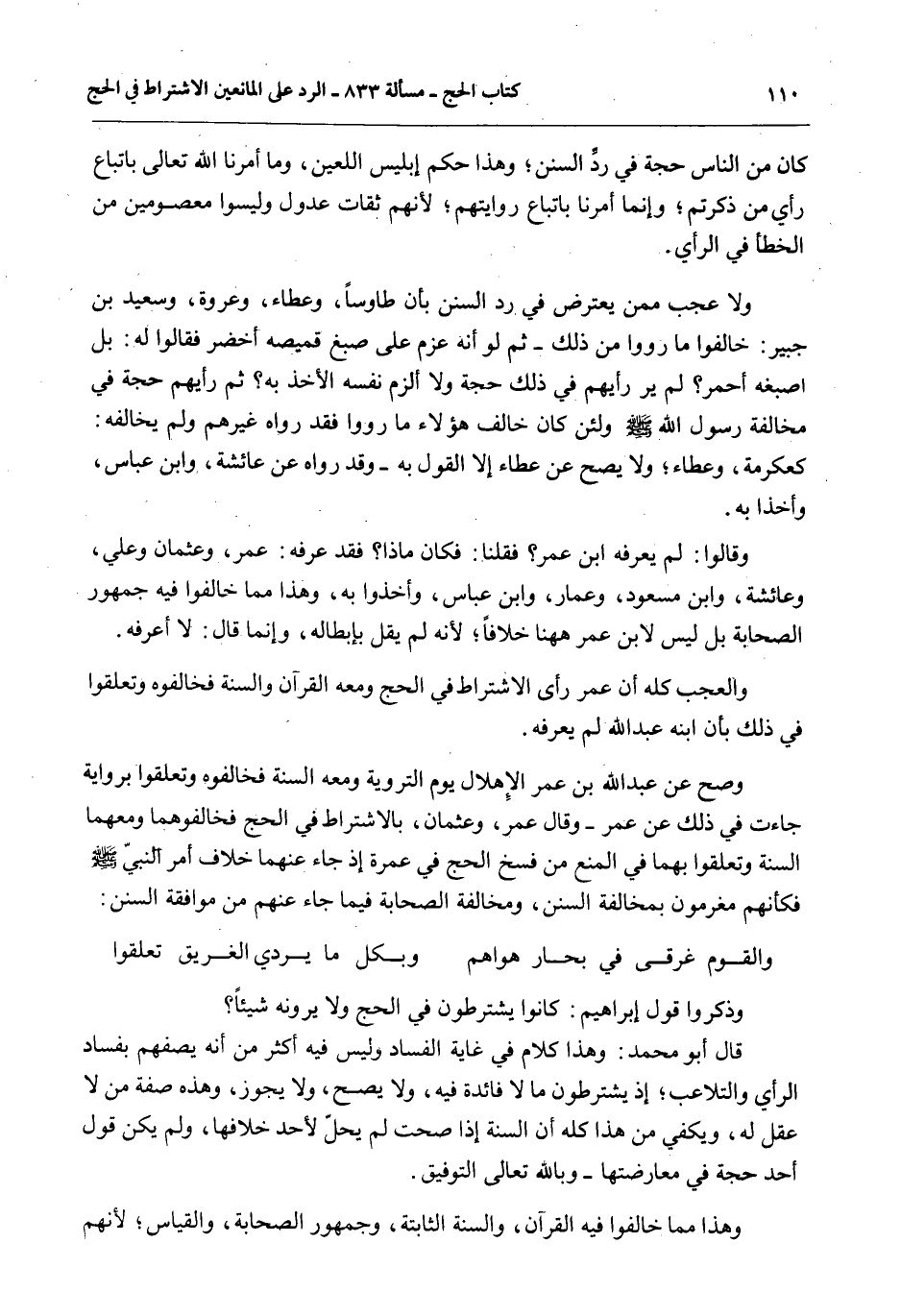 وَصَحَّ عَنْ عَبْدِ اللَّهِ بْنِ عُمَرَ الْإِهْلَالُ يَوْمَ التَّرْوِيَةِ وَمَعَهُ السُّنَّةُ فَخَالَفُوهُ وَتَعَلَّقُوا بِرِوَايَةٍ جَاءَتْ فِي ذَلِكَ عَنْ عُمَرَ - وَقَالَ عُمَرُ، وَعُثْمَانُ، بِالِاشْتِرَاطِ فِي الْحَجِّ فَخَالَفُوهُمَا وَمَعَهُمَا السُّنَّةُ وَتَعَلَّقُوا بِهِمَا فِي الْمَنْعِ مِنْ فَسْخِ الْحَجِّ فِي عُمْرَةٍ إذْ جَاءَ عَنْهُمَا خِلَافُ أَمْرِ النَّبِيِّ - صَلَّى اللَّهُ عَلَيْهِ وَسَلَّمَ - فَكَأَنَّهُمْ مُغْرَمُونَ بِمُخَالَفَةِ السُّنَنِ، وَمُخَالَفَةِ الصَّحَابَةِ فِيمَا جَاءَ عَنْهُمْ مِنْ مُوَافَقَةِ السُّنَنِ: وَالْقَوْمُ غَرْقَى فِي بِحَارِ هَوَاهُمْ وَبِكُلِّ مَا يُرْدِي الْغَرِيقَ تَعَلَّقُوا وَذَكَرُوا قَوْلَ إبْرَاهِيمَ: كَانُوا يَشْتَرِطُونَ فِي الْحَجِّ وَلَا يَرَوْنَهُ شَيْئًا؟ قَالَ أَبُو مُحَمَّدٍ: وَهَذَا كَلَامٌ فِي غَايَةِ الْفَسَادِ وَلَيْسَ فِيهِ أَكْثَرُ مِنْ أَنَّهُ يَصِفُهُمْ بِفَسَادِ الرَّأْيِ وَالتَّلَاعُبِ؛ إذْ يَشْتَرِطُونَ مَا لَا فَائِدَةَ فِيهِ، وَلَا يَصِحُّ، وَلَا يَجُوزُ، وَهَذِهِ صِفَةُ مَنْ لَا عَقْلَ لَهُ، وَيَكْفِي مِنْ هَذَا كُلِّهِ أَنَّ السُّنَّةَ إذَا صَحَّتْ لَمْ يَحِلَّ لِأَحَدٍ خِلَافُهَا، وَلَمْ يَكُنْ قَوْلُ أَحَدٍ حُجَّةً فِي مُعَارَضَتِهَا - وَبِاَللَّهِ تَعَالَى التَّوْفِيقُ.