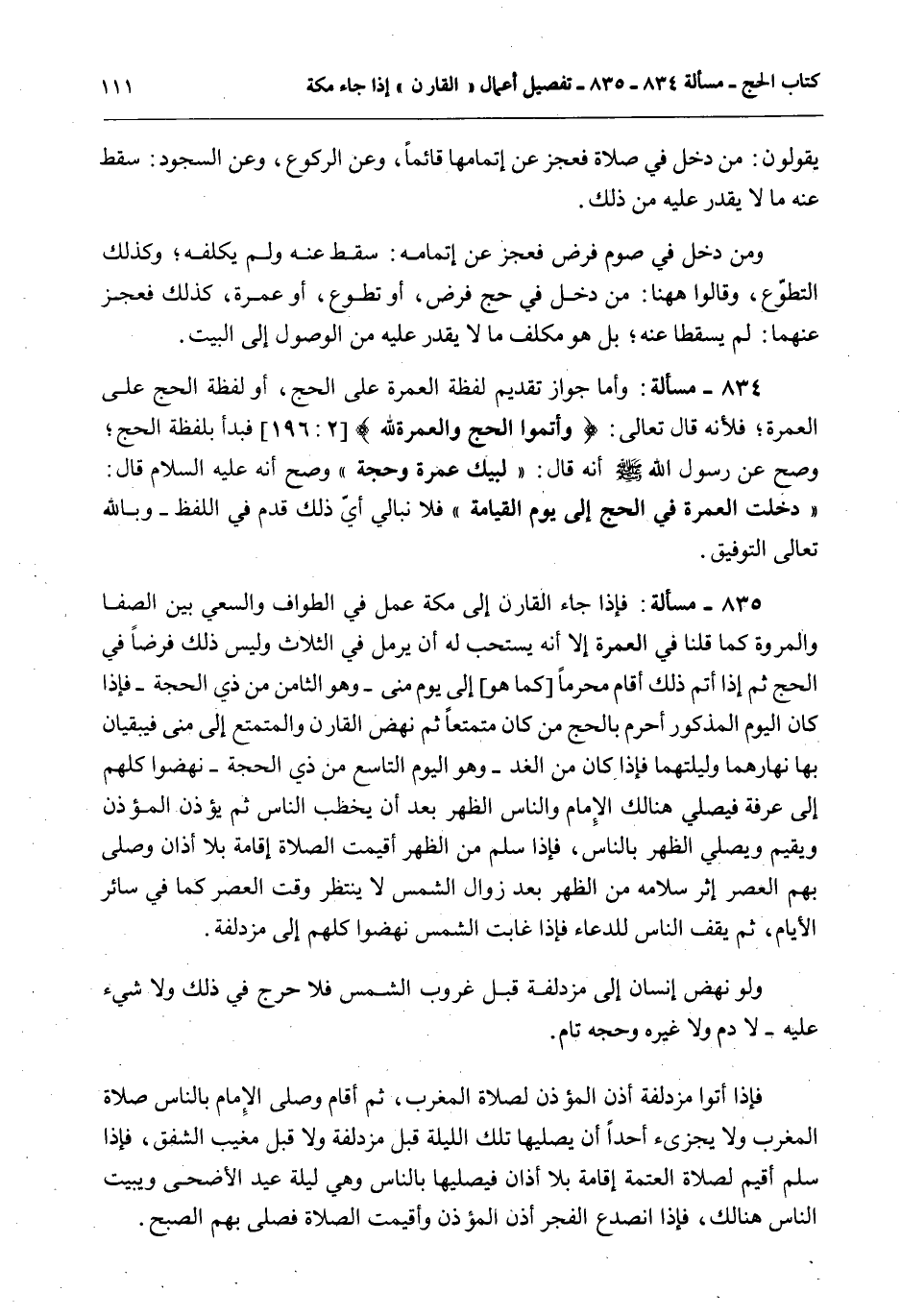 فَإِذَا جَاءَ الْقَارِنُ إلَى مَكَّةَ عَمِلَ فِي الطَّوَافِ وَالسَّعْيِ بَيْنَ الصَّفَا وَالْمَرْوَةِ كَمَا قُلْنَا فِي الْعُمْرَةِ إلَّا أَنَّهُ يُسْتَحَبُّ لَهُ أَنْ يَرْمُلَ فِي الثَّلَاثِ، وَلَيْسَ ذَلِكَ فَرْضًا فِي الْحَجِّ ثُمَّ إذَا أَتَمَّ ذَلِكَ أَقَامَ مُحْرِمًا [كَمَا هُوَ] إلَى يَوْمِ مِنًى - وَهُوَ الثَّامِنُ مِنْ ذِي الْحِجَّةِ - فَإِذَا كَانَ الْيَوْمُ الْمَذْكُورُ أَحْرَمَ بِالْحَجِّ مَنْ كَانَ مُتَمَتِّعًا ثُمَّ نَهَضَ الْقَارِنُ، وَالْمُتَمَتِّعُ إلَى مِنًى فَيَبْقَيَانِ بِهَا نَهَارَهُمَا وَلَيْلَتَهُمَا فَإِذَا كَانَ مِنْ الْغَدِ - وَهُوَ الْيَوْمُ التَّاسِعُ مِنْ ذِي الْحِجَّةِ - نَهَضُوا كُلُّهُمْ إلَى عَرَفَةَ فَيُصَلِّي هُنَالِكَ الْإِمَامُ وَالنَّاسُ الظُّهْرَ بَعْدَ أَنْ يَخْطُبَ النَّاسَ ثُمَّ يُؤَذِّنَ الْمُؤَذِّنُ، وَيُقِيمَ وَيُصَلِّيَ الظُّهْرَ بِالنَّاسِ، فَإِذَا سَلَّمَ مِنْ الظُّهْرِ أُقِيمَتْ الصَّلَاةُ إقَامَةً بِلَا أَذَانٍ وَصَلَّى بِهِمْ الْعَصْرَ إثْرَ سَلَامِهِ مِنْ الظُّهْرِ بَعْدَ زَوَالِ الشَّمْسِ لَا يَنْتَظِرُ وَقْتَ الْعَصْرِ كَمَا فِي سَائِرِ الْأَيَّامِ، ثُمَّ يَقِفُ النَّاسُ لِلدُّعَاءِ فَإِذَا غَابَتْ الشَّمْسُ نَهَضُوا كُلُّهُمْ إلَى مُزْدَلِفَةَ.