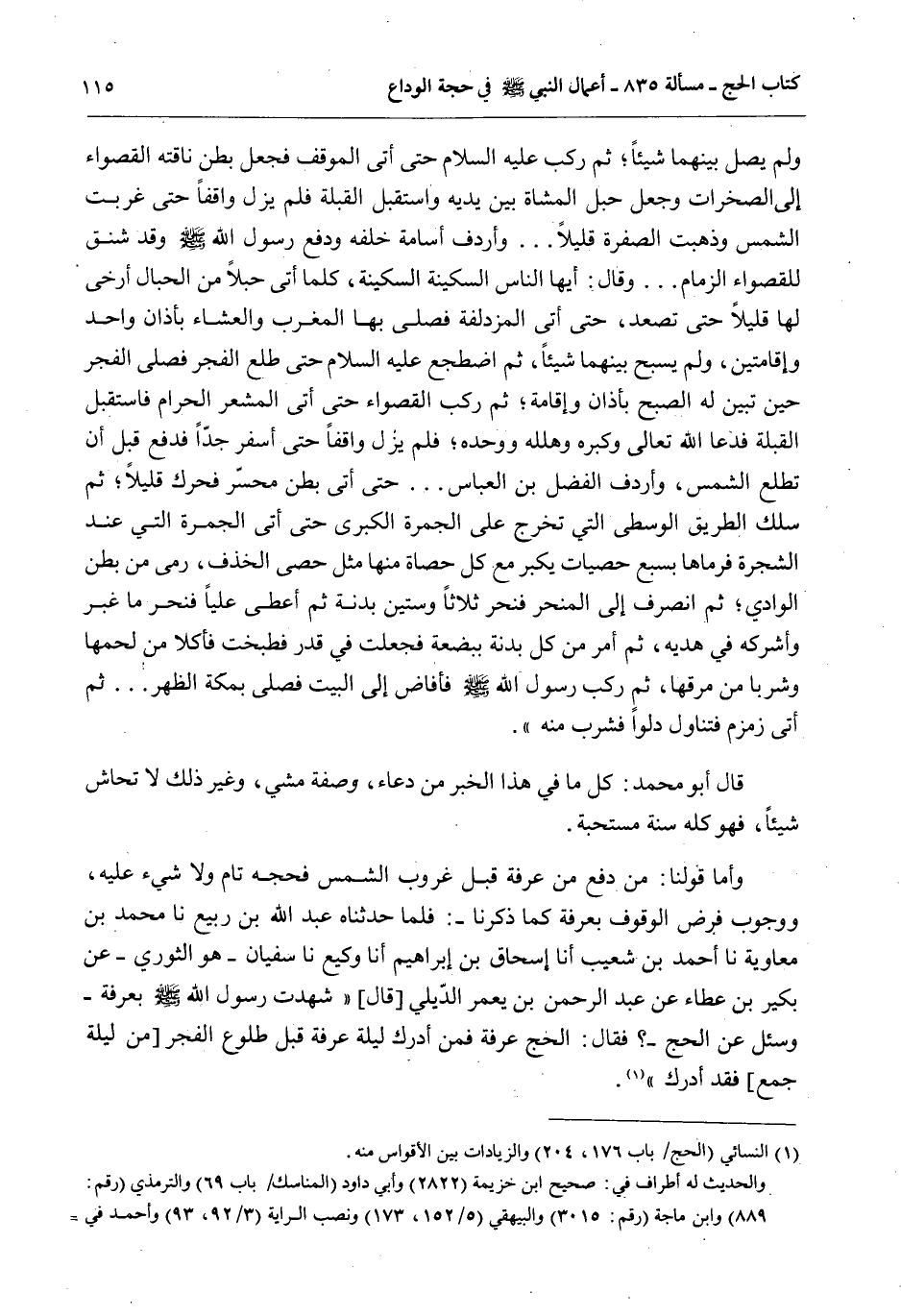 وَلَمْ يُصَلِّ بَيْنَهُمَا شَيْئًا؛ ثُمَّ رَكِبَ - عَلَيْهِ السَّلَامُ - حَتَّى أَتَى الْمَوْقِفَ فَجَعَلَ بَطْنَ نَاقَتِهِ الْقَصْوَاءِ إلَى الصَّخَرَاتِ، وَجَعَلَ حَبْلَ الْمُشَاةِ بَيْنَ يَدَيْهِ وَاسْتَقْبَلَ الْقِبْلَةَ فَلَمْ يَزَلْ وَاقِفًا حَتَّى غَرَبَتْ الشَّمْسُ وَذَهَبَتْ الصُّفْرَةُ قَلِيلًا. . . وَأَرْدَفَ أُسَامَةَ خَلْفَهُ وَدَفَعَ رَسُولُ اللَّهِ - صَلَّى اللَّهُ عَلَيْهِ وَسَلَّمَ - وَقَدْ شَنَقَ لِلْقَصْوَاءِ الزِّمَامَ، وَقَالَ: أَيُّهَا النَّاسُ السَّكِينَةَ السَّكِينَةَ، كُلَّمَا أَتَى جَبَلًا مِنْ الْجِبَالِ أَرْخَى لَهَا قَلِيلًا حَتَّى تَصْعَدَ، حَتَّى أَتَى الْمُزْدَلِفَةَ فَصَلَّى بِهَا الْمَغْرِبَ وَالْعِشَاءَ بِأَذَانٍ وَاحِدٍ وَإِقَامَتَيْنِ، وَلَمْ يُسَبِّحْ بَيْنَهُمَا شَيْئًا، ثُمَّ اضْطَجَعَ - عَلَيْهِ السَّلَامُ - حَتَّى طَلَعَ الْفَجْرُ فَصَلَّى الْفَجْرَ حِينَ تَبَيَّنَ لَهُ الصُّبْحُ بِأَذَانٍ وَإِقَامَةٍ؛ ثُمَّ رَكِبَ الْقَصْوَاءَ حَتَّى أَتَى الْمَشْعَرَ الْحَرَامَ فَاسْتَقْبَلَ الْقِبْلَةَ فَدَعَا اللَّهَ تَعَالَى وَكَبَّرَهُ وَهَلَّلَهُ وَوَحَّدَهُ؛ فَلَمْ يَزَلْ وَاقِفًا حَتَّى أَسْفَرَ جِدًّا فَدَفَعَ قَبْلَ أَنْ تَطْلُعَ الشَّمْسُ، وَأَرْدَفَ الْفَضْلَ بْنَ الْعَبَّاسِ حَتَّى أَتَى بَطْنَ مُحَسِّرٍ فَحَرَّكَ قَلِيلًا؛ ثُمَّ سَلَكَ الطَّرِيقَ الْوُسْطَى الَّتِي تَخْرُجُ عَلَى الْجَمْرَةِ الْكُبْرَى حَتَّى أَتَى الْجَمْرَةَ الَّتِي عِنْدَ الشَّجَرَةِ فَرَمَاهَا بِسَبْعِ حَصَيَاتٍ يُكَبِّرُ مَعَ كُلِّ حَصَاةٍ مِنْهَا مِثْلَ حَصَى الْخَذْفِ، رَمَى مِنْ بَطْنِ الْوَادِي؛ ثُمَّ انْصَرَفَ إلَى الْمَنْحَرِ فَنَحَرَ ثَلَاثًا وَسِتِّينَ بَدَنَةً ثُمَّ أَعْطَى عَلِيًّا فَنَحَرَ مَا غَبَرَ وَأَشْرَكَهُ فِي هَدْيِهِ. ثُمَّ أَمَرَ مِنْ كُلِّ بَدَنَةٍ بِبِضْعَةٍ فَجُعِلَتْ فِي قِدْرٍ فَطُبِخَتْ فَأَكَلَا مِنْ لَحْمِهَا وَشَرِبَا مِنْ مَرَقِهَا، ثُمَّ رَكِبَ رَسُولُ اللَّهِ - صَلَّى اللَّهُ عَلَيْهِ وَسَلَّمَ - فَأَفَاضَ إلَى الْبَيْتِ فَصَلَّى بِمَكَّةَ الظُّهْرَ. ثُمَّ أَتَى زَمْزَمَ فَتَنَاوَلَ دَلْوًا فَشَرِبَ مِنْهُ» .
