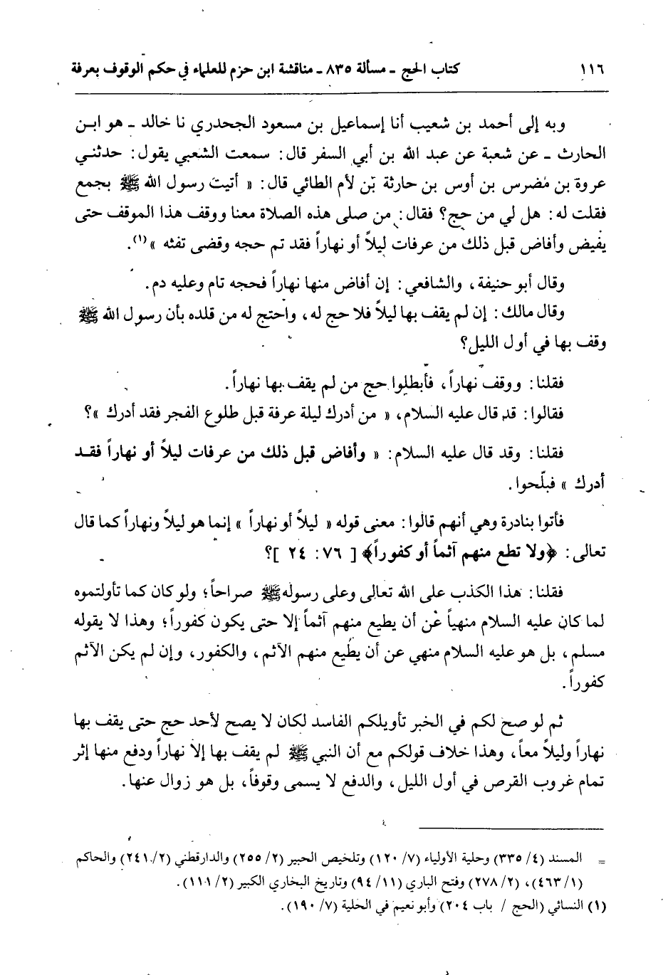 ثُمَّ لَوْ صَحَّ لَكُمْ فِي الْخَبَرِ تَأْوِيلُكُمْ الْفَاسِدُ لَكَانَ لَا يَصِحُّ لِأَحَدٍ حَجٌّ حَتَّى يَقِفَ بِهَا نَهَارًا وَلَيْلًا مَعًا، وَهَذَا خِلَافُ قَوْلِكُمْ مَعَ أَنَّ النَّبِيَّ - صَلَّى اللَّهُ عَلَيْهِ وَسَلَّمَ - لَمْ يَقِفْ بِهَا إلَّا نَهَارًا وَدَفَعَ مِنْهَا إثْرَ تَمَامِ غُرُوبِ الْقُرْصِ فِي أَوَّلِ اللَّيْلِ، وَالدَّفْعُ لَا يُسَمَّى وُقُوفًا، بَلْ هُوَ زَوَالٌ عَنْهَا.