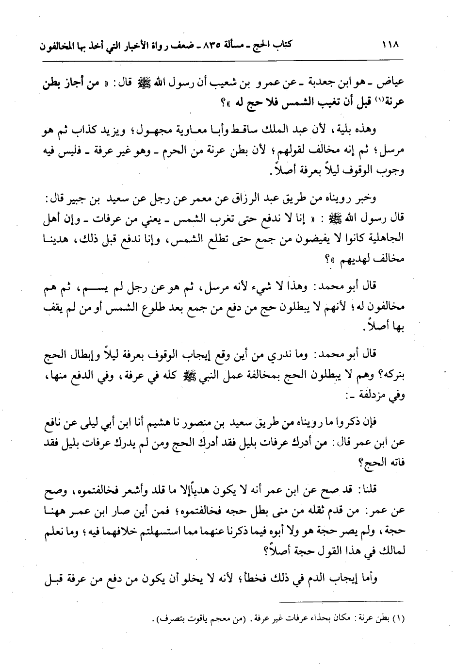 يَزِيدَ بْنِ عِيَاضٍ هُوَ ابْنُ جُعْدُبَةَ - عَنْ عَمْرِو بْنِ شُعَيْبٍ أَنَّ رَسُولَ اللَّهِ - صَلَّى اللَّهُ عَلَيْهِ وَسَلَّمَ - قَالَ: «مَنْ أَجَازَ بَطْنَ عُرَنَةَ قَبْلَ أَنْ تَغِيبَ الشَّمْسُ فَلَا حَجَّ لَهُ» ؟ وَهَذِهِ بَلِيَّةٌ، لِأَنَّ عَبْدَ الْمَلِكِ سَاقِطٌ وَأَبَا مُعَاوِيَةَ مَجْهُولٌ؛ وَيَزِيدَ كَذَّابٌ ثُمَّ هُوَ مُرْسَلٌ؛ ثُمَّ إنَّهُ مُخَالِفٌ لِقَوْلِهِمْ؛ لِأَنَّ بَطْنَ عُرَنَةَ مِنْ الْحَرَمِ - وَهُوَ غَيْرُ عَرَفَةَ - فَلَيْسَ فِيهِ وُجُوبُ الْوُقُوفِ لَيْلًا بِعَرَفَةَ أَصْلًا.