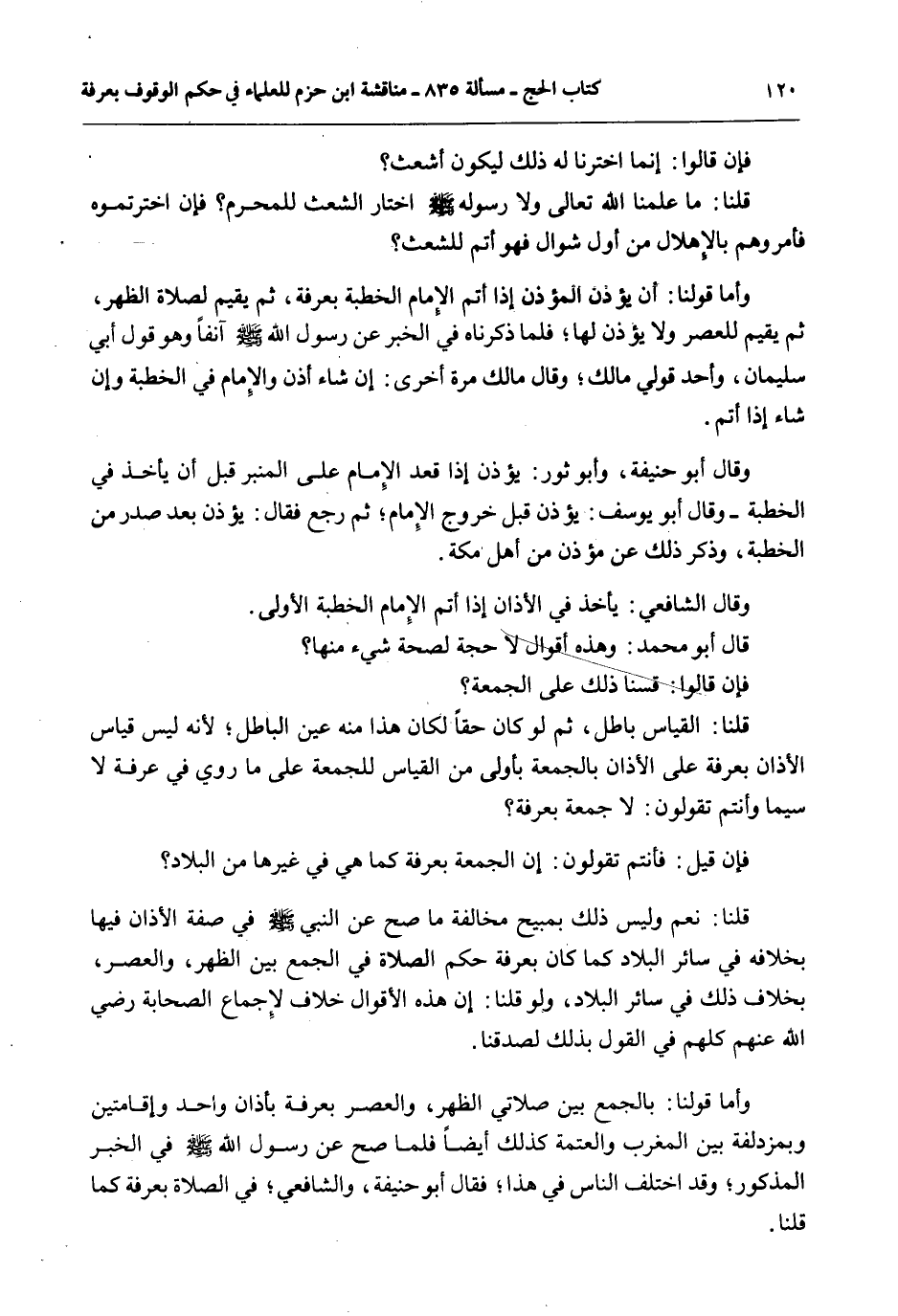 قَالَ أَبُو مُحَمَّدٍ: وَهَذِهِ أَقْوَالٌ لَا حُجَّةَ لِصِحَّةِ شَيْءٍ مِنْهَا؟ فَإِنْ قَالُوا: قِسْنَا ذَلِكَ عَلَى الْجُمُعَةِ؟ قُلْنَا: الْقِيَاسُ بَاطِلٌ، ثُمَّ لَوْ كَانَ حَقًّا لَكَانَ هَذَا مِنْهُ عَيْنَ الْبَاطِلِ؛ لِأَنَّهُ لَيْسَ قِيَاسُ الْأَذَانِ بِعَرَفَةَ عَلَى الْأَذَانِ بِالْجُمُعَةِ بِأَوْلَى مِنْ الْقِيَاسِ لِلْجُمُعَةِ عَلَى مَا رُوِيَ فِي عَرَفَةَ لَا سِيَّمَا وَأَنْتُمْ تَقُولُونَ: لَا جُمُعَةَ بِعَرَفَةَ؟ فَإِنْ قِيلَ: فَأَنْتُمْ تَقُولُونَ: إنَّ الْجُمُعَةَ بِعَرَفَةَ كَمَا هِيَ فِي غَيْرِهَا مِنْ الْبِلَادِ؟ قُلْنَا: نَعَمْ، وَلَيْسَ ذَلِكَ بِمُبِيحٍ مُخَالَفَةَ مَا صَحَّ عَنْ النَّبِيِّ - صَلَّى اللَّهُ عَلَيْهِ وَسَلَّمَ - فِي صِفَةِ الْأَذَانِ فِيهَا بِخِلَافِهِ فِي سَائِرِ الْبِلَادِ كَمَا كَانَ بِعَرَفَةَ حُكْمُ الصَّلَاةِ فِي الْجَمْعِ بَيْنَ الظُّهْرِ، وَالْعَصْرِ، بِخِلَافِ ذَلِكَ فِي سَائِرِ الْبِلَادِ، وَلَوْ قُلْنَا: إنَّ هَذِهِ الْأَقْوَالَ خِلَافٌ لِإِجْمَاعِ الصَّحَابَةِ - رَضِيَ اللَّهُ عَنْهُمْ - كُلِّهِمْ فِي الْقَوْلِ بِذَلِكَ لَصَدَقْنَا.
