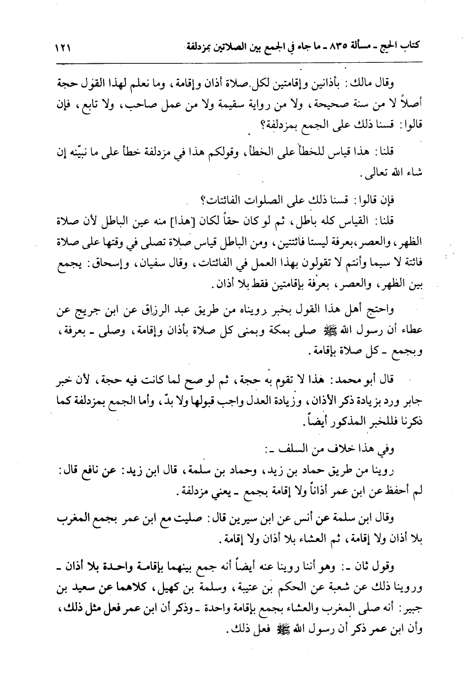 قَالَ أَبُو مُحَمَّدٍ: هَذَا لَا تَقُومُ بِهِ حُجَّةٌ، ثُمَّ لَوْ صَحَّ لَمَا كَانَتْ فِيهِ حُجَّةٌ، لِأَنَّ خَبَرَ جَابِرٍ وَرَدَ بِزِيَادَةِ ذِكْرِ الْأَذَانِ، وَزِيَادَةُ الْعَدْلِ وَاجِبٌ قَبُولُهَا، وَلَا بُدَّ، وَأَمَّا الْجَمْعُ بِمُزْدَلِفَةَ كَمَا ذَكَرْنَا فَلِلْخَبَرِ الْمَذْكُورِ أَيْضًا.