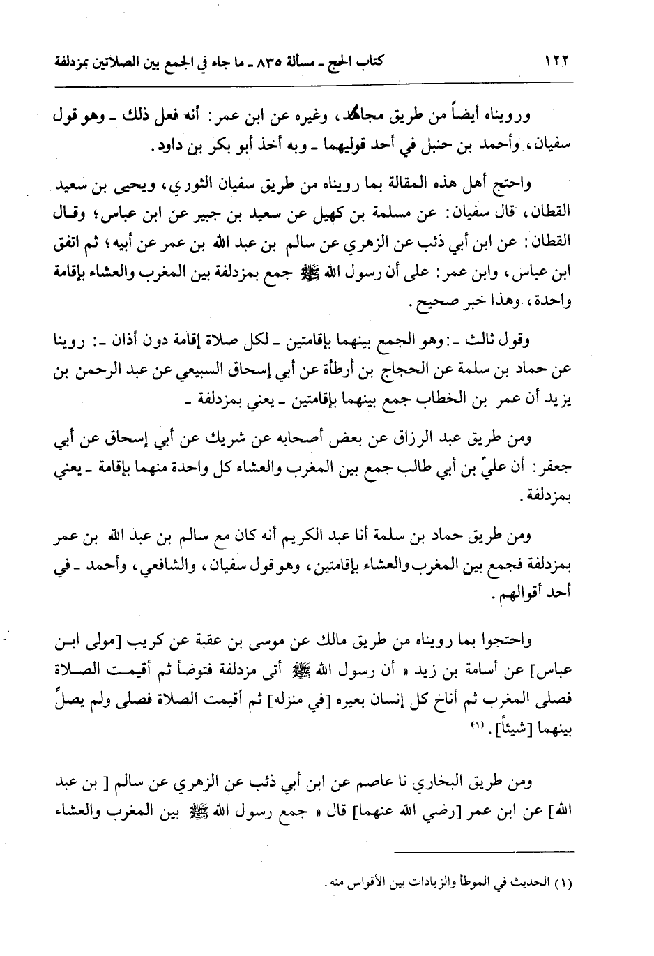 وَمِنْ طَرِيقِ حَمَّادِ بْنِ سَلَمَةَ أَنَا عَبْدُ الْكَرِيمِ أَنَّهُ كَانَ مَعَ سَالِمِ بْنِ عَبْدِ اللَّهِ بْنِ عُمَرَ بِمُزْدَلِفَةَ فَجَمَعَ بَيْنَ الْمَغْرِبِ وَالْعِشَاءِ بِإِقَامَتَيْنِ، وَهُوَ قَوْلُ سُفْيَانَ، وَالشَّافِعِيِّ، وَأَحْمَدَ - فِي أَحَدِ أَقْوَالِهِمْ.