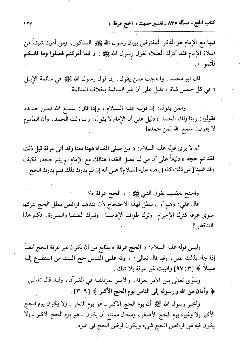 وَمِمَّنْ يَقُولُ: إنَّ قَوْلَهُ - عَلَيْهِ السَّلَامُ - «وَإِذَا قَالَ: سَمِعَ اللَّهُ لِمَنْ حَمِدَهُ فَقُولُوا: رَبَّنَا وَلَكَ الْحَمْدُ» دَلِيلٌ أَنَّ الْإِمَامَ لَا يَقُولُ: رَبَّنَا وَلَك الْحَمْدُ، وَأَنَّ الْمَأْمُومَ لَا يَقُولُ: سَمِعَ اللَّهُ لِمَنْ حَمِدَهُ ثُمَّ لَا يَرَى قَوْلَهُ - عَلَيْهِ السَّلَامُ -: «مَنْ صَلَّى الْغَدَاةَ هَاهُنَا مَعَنَا، وَقَدْ أَتَى عَرَفَةَ قَبْلَ ذَلِكَ فَقَدْ تَمَّ حَجُّهُ» دَلِيلًا عَلَى أَنَّ مَنْ لَمْ يُصَلِّ الْغَدَاةَ هُنَالِكَ مَعَ الْإِمَامِ لَمْ يَتِمَّ حَجُّهُ؛ فَكَيْفَ وَقَدْ غُنِينَا [عَنْ ذَلِكَ كُلِّهِ] بِنَصِّهِ - عَلَيْهِ السَّلَامُ -؟ عَلَى أَنَّهُ إنْ لَمْ يُدْرِكْ ذَلِكَ فَلَمْ يُدْرِكْ الْحَجَّ.