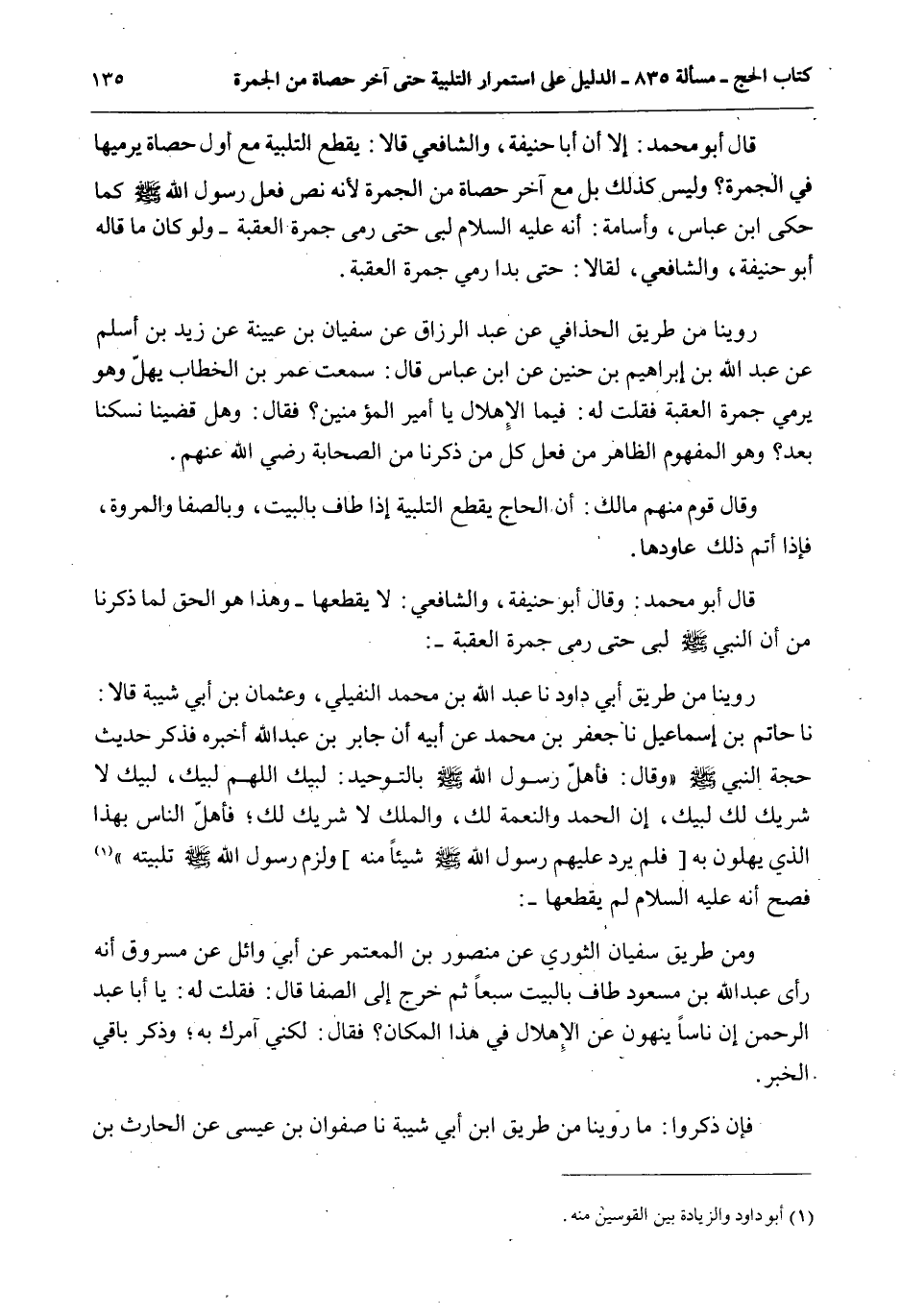 رُوِّينَا مِنْ طَرِيقِ الْحُذَافِيِّ عَنْ عَبْدِ الرَّزَّاقِ عَنْ سُفْيَانَ بْنِ عُيَيْنَةَ عَنْ زَيْدِ بْنِ أَسْلَمَ عَنْ عَبْدِ اللَّهِ بْنِ إبْرَاهِيمَ بْنِ حُنَيْنٍ عَنْ ابْنِ عَبَّاسٍ قَالَ: سَمِعْت عُمَرَ بْنَ الْخَطَّابِ يُهِلُّ وَهُوَ يَرْمِي جَمْرَةَ الْعَقَبَةِ فَقُلْت لَهُ: فِيمَا الْإِهْلَالُ يَا أَمِيرَ الْمُؤْمِنِينَ؟ فَقَالَ: وَهَلْ قَضَيْنَا نُسُكَنَا بَعْدُ؟ وَهُوَ الْمَفْهُومُ الظَّاهِرُ مِنْ فِعْلِ كُلِّ مَنْ ذَكَرْنَا مِنْ الصَّحَابَةِ - رَضِيَ اللَّهُ عَنْهُمْ -.