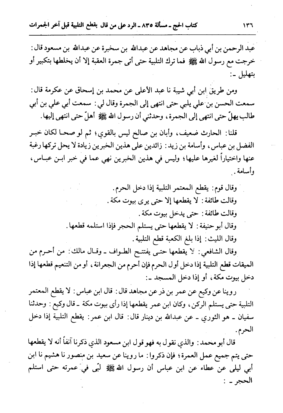 الْحَارِثِ بْنِ عَبْدِ الرَّحْمَنِ بْنِ أَبِي ذُبَابٍ عَنْ مُجَاهِدٍ عَنْ عَبْدِ اللَّهِ بْنِ سَخْبَرَةَ عَنْ «عَبْدِ اللَّهِ بْنِ مَسْعُودٍ قَالَ: خَرَجْتُ مَعَ رَسُولِ اللَّهِ - صَلَّى اللَّهُ عَلَيْهِ وَسَلَّمَ - فَمَا تَرَكَ التَّلْبِيَةَ حَتَّى أَتَى جَمْرَةَ الْعَقَبَةِ إلَّا أَنْ يَخْلِطَهَا بِتَكْبِيرٍ أَوْ بِتَهْلِيلٍ -: وَمِنْ طَرِيقِ» ابْنِ أَبِي شَيْبَةَ نَا عَبْدُ الْأَعْلَى عَنْ مُحَمَّدِ بْنِ إِسْحَاقَ عَنْ عِكْرِمَةَ قَالَ: «سَمِعْتُ الْحَسَنَ بْنَ عَلِيٍّ يُلَبِّي حَتَّى انْتَهَى إلَى الْجَمْرَةِ وَقَالَ لِي: سَمِعْتُ أَبِي عَلِيَّ بْنَ أَبِي طَالِبٍ يُهِلُّ حَتَّى انْتَهَى إلَى الْجَمْرَةِ، وَحَدَّثَنِي أَنَّ رَسُولَ اللَّهِ - صَلَّى اللَّهُ عَلَيْهِ وَسَلَّمَ - أَهَلَّ حَتَّى انْتَهَى إلَيْهَا» .