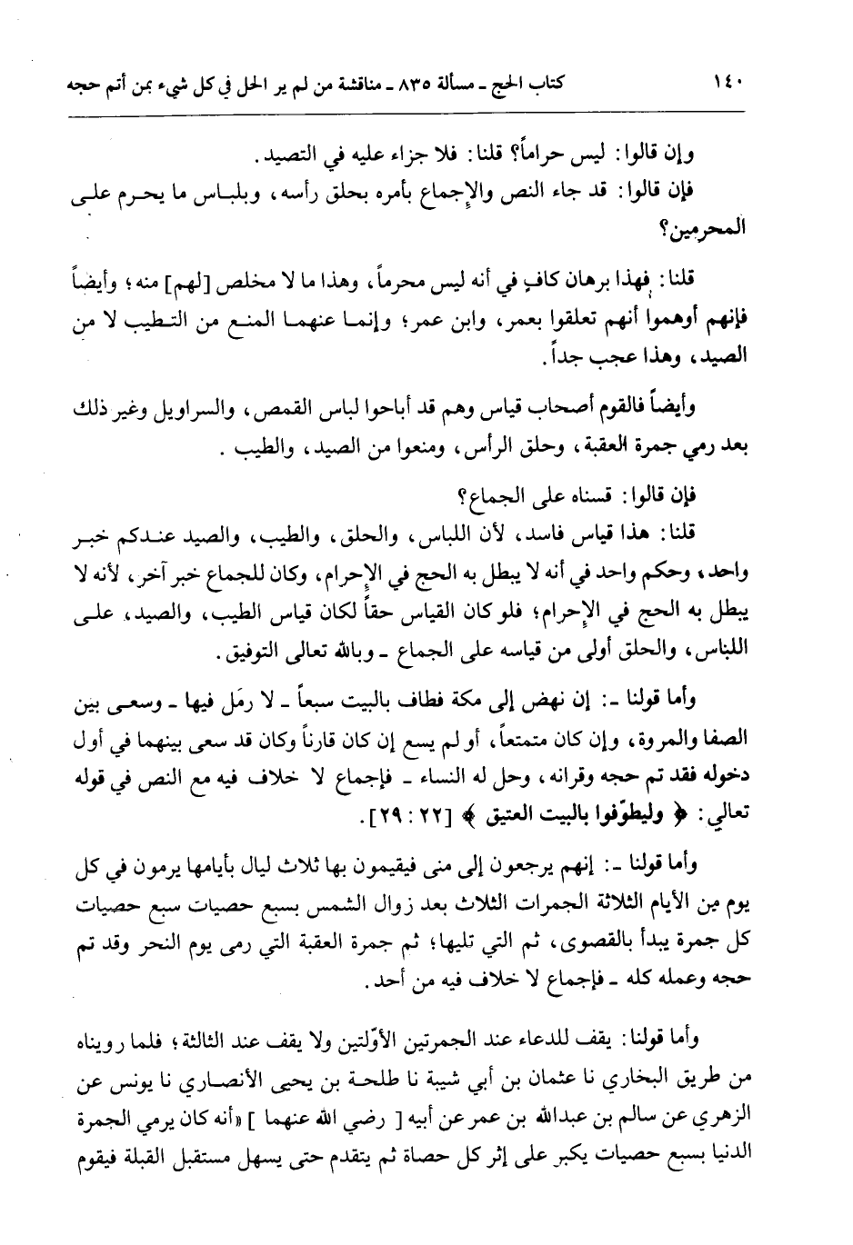 وَأَيْضًا فَالْقَوْمُ أَصْحَابُ قِيَاسٍ، وَهُمْ قَدْ أَبَاحُوا لِبَاسَ الْقُمُصَ، وَالسَّرَاوِيلَ وَغَيْرَ ذَلِكَ بَعْدَ رَمْيِ جَمْرَةِ الْعَقَبَةِ، وَحَلْقِ الرَّأْسِ، وَمَنَعُوا مِنْ الصَّيْدِ، وَالطِّيبِ.