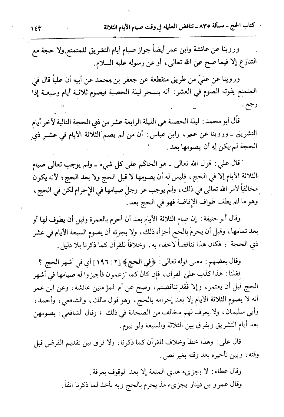 قَالَ عَلِيٌّ: قَوْلُ اللَّهِ تَعَالَى - هُوَ الْحَاكِمُ عَلَى كُلِّ شَيْءٍ - وَلَمْ يُوجِبْ - تَعَالَى - صِيَامَ الثَّلَاثَةِ الْأَيَّامِ إلَّا فِي الْحَجِّ، فَلَيْسَ لَهُ أَنْ يَصُومَهَا لَا قَبْلَ الْحَجِّ وَلَا بَعْدَ الْحَجِّ؛ لِأَنَّهُ يَكُونُ مُخَالِفًا لِأَمْرِ اللَّهِ - تَعَالَى - فِي ذَلِكَ، وَلَمْ يُوجِبْ - عَزَّ وَجَلَّ - صِيَامَهَا فِي الْإِحْرَامِ لَكِنْ فِي الْحَجِّ، وَهُوَ مَا لَمْ يَطُفْ طَوَافَ الْإِفَاضَةِ فَهُوَ فِي الْحَجِّ بَعْدُ.
