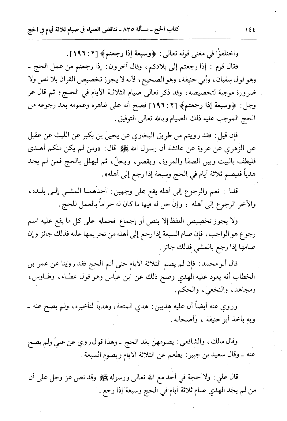فَقَالَ قَوْمٌ: إذَا رَجَعْتُمْ إلَى بِلَادِكُمْ، وَقَالَ آخَرُونَ: إذَا رَجَعْتُمْ مِنْ عَمَلِ الْحَجِّ - وَهُوَ قَوْلُ سُفْيَانَ، وَأَبِي حَنِيفَةَ، وَهُوَ الصَّحِيحُ؛ لِأَنَّهُ لَا يَجُوزُ تَخْصِيصُ الْقُرْآنِ بِلَا نَصٍّ وَلَا ضَرُورَةَ مُوجِبَةٌ لِتَخْصِيصِهِ، وَقَدْ ذَكَرَ - تَعَالَى - صِيَامَ الثَّلَاثَةِ الْأَيَّامِ فِي الْحَجِّ؛ ثُمَّ قَالَ عَزَّ وَجَلَّ: {وَسَبْعَةٍ إِذَا رَجَعْتُمْ} [البقرة: 196] فَصَحَّ أَنَّهُ عَلَى ظَاهِرِهِ وَعُمُومِهِ بَعْدَ رُجُوعِهِ مِنْ الْحَجِّ الْمُوجِبِ عَلَيْهِ ذَلِكَ الصِّيَامَ وَبِاَللَّهِ - تَعَالَى - التَّوْفِيقُ.