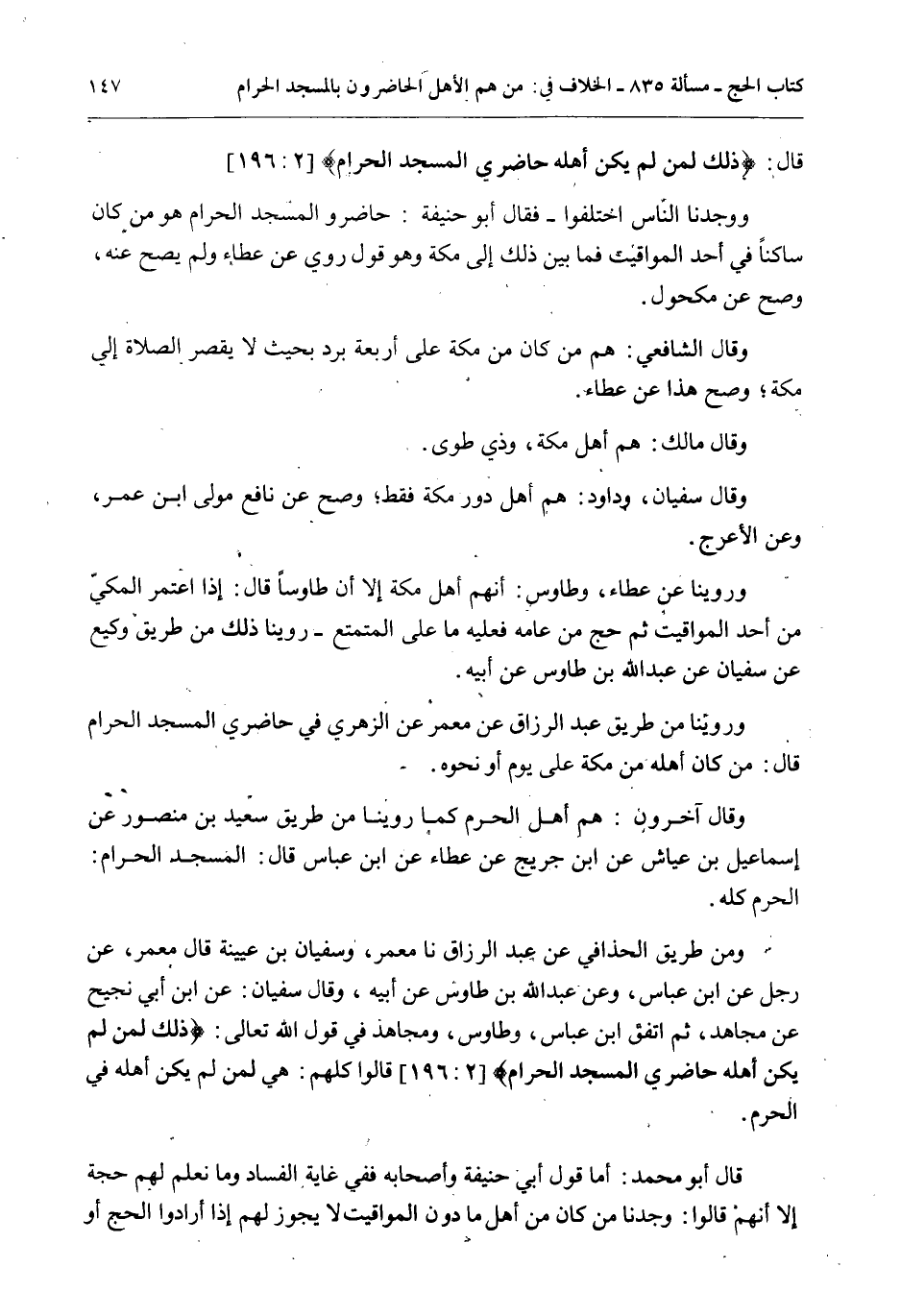 قَالَ: {ذَلِكَ لِمَنْ لَمْ يَكُنْ أَهْلُهُ حَاضِرِي الْمَسْجِدِ الْحَرَامِ} [البقرة: 196] وَوَجَدْنَا النَّاسَ اخْتَلَفُوا - فَقَالَ أَبُو حَنِيفَةَ: حَاضِرُو الْمَسْجِدِ الْحَرَامِ هُوَ مَنْ كَانَ سَاكِنًا فِي أَحَدِ الْمَوَاقِيتِ فَمَا بَيْنَ ذَلِكَ إلَى مَكَّةَ وَهُوَ قَوْلٌ رُوِيَ عَنْ عَطَاءٍ وَلَمْ يَصِحَّ عَنْهُ، وَصَحَّ عَنْ مَكْحُولٍ. وَقَالَ الشَّافِعِيُّ: هُمْ مَنْ كَانَ مِنْ مَكَّةَ عَلَى أَرْبَعَةِ بُرْدٍ بِحَيْثُ لَا يَقْصُرُ الصَّلَاةَ إلَى مَكَّةَ؛ وَصَحَّ هَذَا عَنْ عَطَاءٍ. وَقَالَ مَالِكٌ: هُمْ أَهْلُ مَكَّةَ، وَذِي طُوًى. وَقَالَ سُفْيَانُ، وَدَاوُد: هُمْ أَهْلُ دُورِ مَكَّةَ فَقَطْ؛ وَصَحَّ عَنْ نَافِعٍ مَوْلَى ابْنِ عُمَرَ، وَعَنْ الْأَعْرَجِ. وَرُوِّينَا عَنْ عَطَاءٍ، وَطَاوُسٍ: أَنَّهُمْ أَهْلُ مَكَّةَ إلَّا أَنَّ طَاوُسًا قَالَ: إذَا اعْتَمَرَ الْمَكِّيُّ مِنْ أَحَدِ الْمَوَاقِيتِ ثُمَّ حَجَّ مِنْ عَامِهِ فَعَلَيْهِ مَا عَلَى الْمُتَمَتِّعِ - رُوِّينَا ذَلِكَ مِنْ طَرِيقِ وَكِيعٍ عَنْ سُفْيَانَ عَنْ عَبْدِ اللَّهِ بْنِ طَاوُسٍ عَنْ أَبِيهِ.