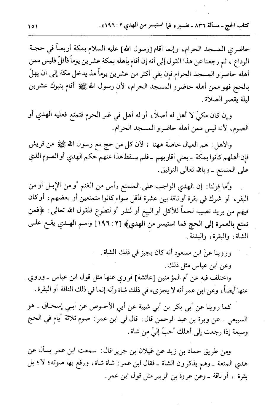 وَمِنْ طَرِيقِ حَمَّادِ بْنِ زَيْدٍ عَنْ غَيْلَانَ بْنِ جَرِيرٍ قَالَ: سَمِعْت ابْنَ عُمَرَ يَسْأَلُ عَنْ هَدْيِ الْمُتْعَةِ - وَهُمْ يَذْكُرُونَ الشَّاةَ - فَقَالَ ابْنُ عُمَرَ: شَاةٌ شَاةٌ، وَرَفَعَ بِهَا صَوْتَهُ؛ لَا؛ بَلْ بَقَرَةٌ، أَوْ نَاقَةٌ - وَعَنْ عُرْوَةَ بْنِ الزُّبَيْرِ مِثْلُ قَوْلِ ابْنِ عُمَرَ.