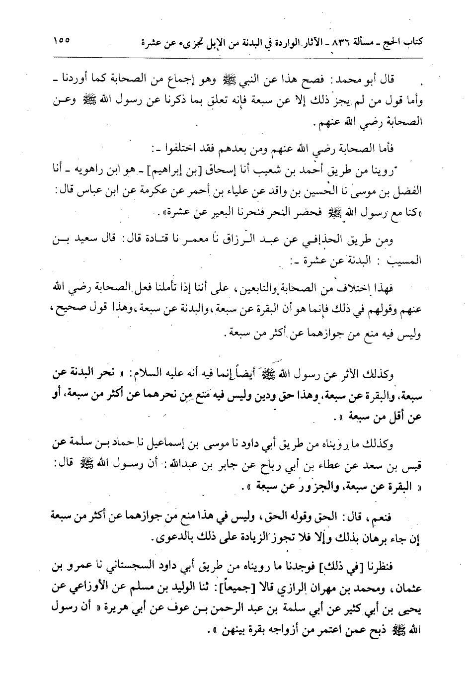 فَأَمَّا الصَّحَابَةُ - رَضِيَ اللَّهُ عَنْهُمْ - وَمَنْ بَعْدَهُمْ فَقَدْ اخْتَلَفُوا -: رُوِّينَا مِنْ طَرِيقِ أَحْمَدَ بْنِ شُعَيْبٍ أَنَا إِسْحَاقُ بْنُ إبْرَاهِيمَ هُوَ ابْنُ رَاهْوَيْهِ - أَنَا الْفَضْلُ بْنُ مُوسَى نَا الْحُسَيْنُ بْنُ وَاقِدٍ عَنْ عَلْيَاءَ بْنِ أَحْمَرَ عَنْ عِكْرِمَةَ عَنْ ابْنِ عَبَّاسٍ قَالَ: «كُنَّا مَعَ رَسُولِ اللَّهِ - صَلَّى اللَّهُ عَلَيْهِ وَسَلَّمَ - فَحَضَرَ النَّحْرُ فَنَحَرْنَا الْبَعِيرَ عَنْ عَشَرَةٍ» .