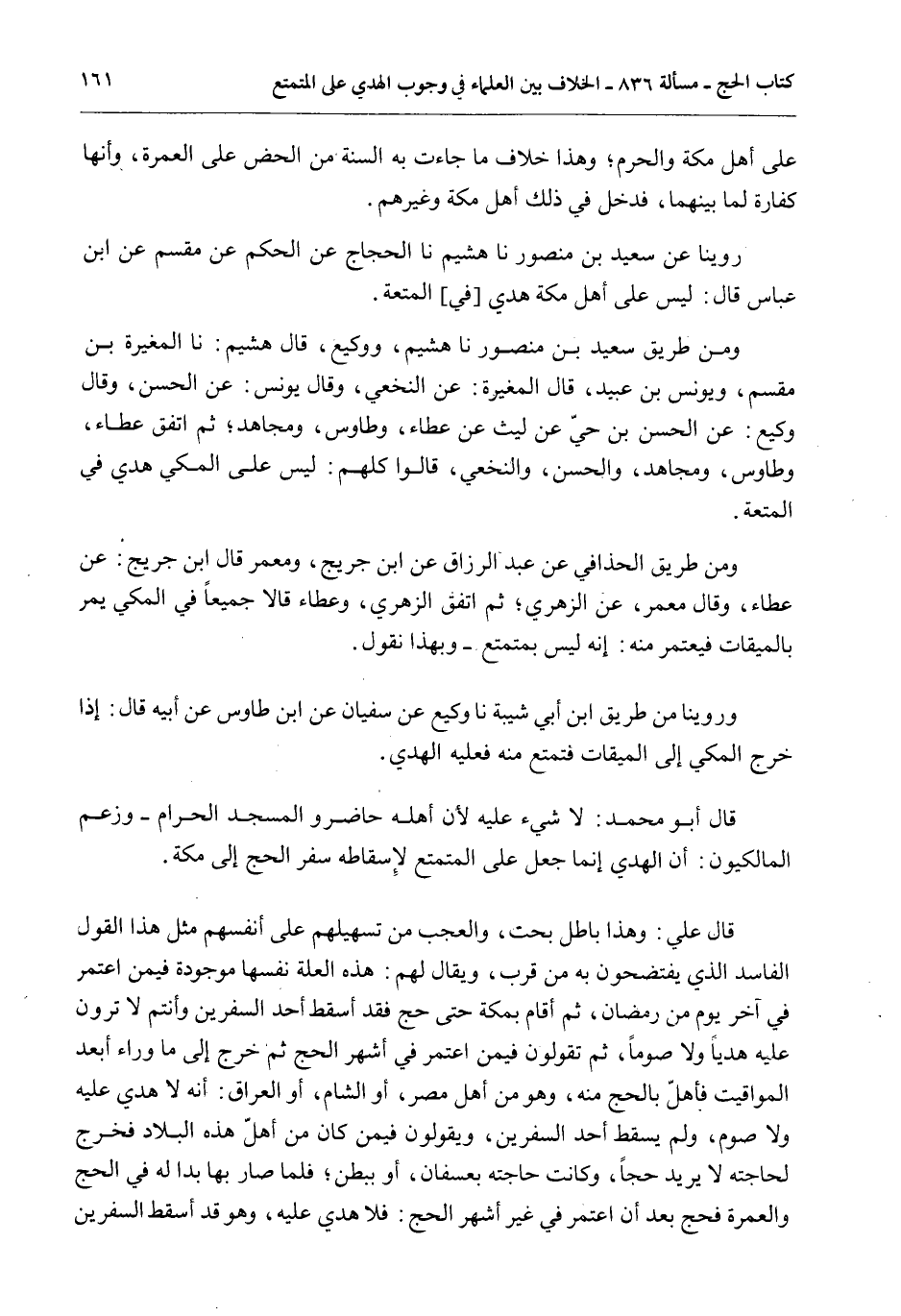 وَمِنْ طَرِيقِ سَعِيدِ بْنِ مَنْصُورٍ نَا هُشَيْمٌ، وَوَكِيعٌ، قَالَ هُشَيْمٌ: نَا الْمُغِيرَةُ بْنُ مِقْسَمٍ، وَيُونُسُ بْنُ عُبَيْدٍ، قَالَ الْمُغِيرَةُ: عَنْ النَّخَعِيِّ، وَقَالَ يُونُسُ: عَنْ الْحَسَنِ، وَقَالَ وَكِيعٌ: عَنْ الْحَسَنِ بْنِ حَيٍّ عَنْ لَيْثٍ عَنْ عَطَاءٍ، وَطَاوُسٍ، وَمُجَاهِدٍ؛ ثُمَّ اتَّفَقَ عَطَاءٌ، وَطَاوُسٌ، وَمُجَاهِدٌ، وَالْحَسَنُ، وَالنَّخَعِيُّ، قَالُوا كُلُّهُمْ: لَيْسَ عَلَى الْمَكِّيِّ هَدْيٌ فِي الْمُتْعَةِ وَمِنْ طَرِيقِ الْحُذَافِيِّ عَنْ عَبْدِ الرَّزَّاقِ عَنْ ابْنِ جُرَيْجٍ، وَمَعْمَرٍ قَالَ ابْنُ جُرَيْجٍ: عَنْ عَطَاءٍ، وَقَالَ مَعْمَرٌ، عَنْ الزُّهْرِيِّ؛ ثُمَّ اتَّفَقَ الزُّهْرِيُّ، وَعَطَاءٌ قَالَا جَمِيعًا فِي الْمَكِّيِّ يَمُرُّ بِالْمِيقَاتِ فَيَعْتَمِرُ مِنْهُ: إنَّهُ لَيْسَ بِمُتَمَتِّعٍ - وَبِهَذَا نَقُولُ.