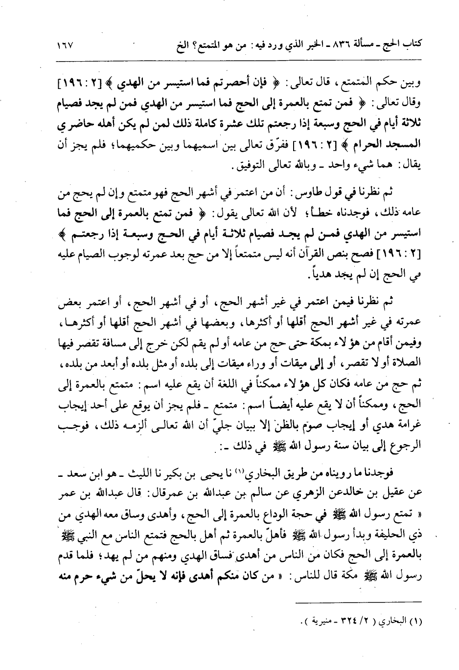 ثُمَّ نَظَرْنَا فِيمَنْ اعْتَمَرَ فِي غَيْرِ أَشْهُرِ الْحَجِّ، أَوْ فِي أَشْهُرِ الْحَجِّ، أَوْ اعْتَمَرَ بَعْضَ عُمْرَتِهِ فِي غَيْرِ أَشْهُرِ الْحَجِّ أَقَلَّهَا أَوْ أَكْثَرَهَا، وَبَعْضَهَا فِي أَشْهُرِ الْحَجِّ أَقَلَّهَا أَوْ أَكْثَرَهَا، وَفِيمَنْ أَقَامَ مِنْ هَؤُلَاءِ بِمَكَّةَ حَتَّى حَجَّ مِنْ عَامِهِ أَوْ لَمْ يُقِمْ لَكِنْ خَرَجَ إلَى مَسَافَةٍ تُقْصَرُ فِيهَا الصَّلَاةُ أَوْ لَا تُقْصَرُ، أَوْ إلَى مِيقَاتٍ أَوْ وَرَاءَ مِيقَاتٍ إلَى بَلَدِهِ أَوْ مِثْلِ بَلَدِهِ أَوْ أَبْعَدَ مِنْ بَلَدِهِ، ثُمَّ حَجَّ مِنْ عَامِهِ فَكَانَ كُلُّ هَؤُلَاءِ مُمْكِنًا فِي اللُّغَةِ أَنْ يَقَعَ عَلَيْهِ اسْمُ: مُتَمَتِّعٌ بِالْعُمْرَةِ إلَى الْحَجِّ، وَمُمْكِنًا أَنْ لَا يَقَعَ عَلَيْهِ أَيْضًا اسْمُ: مُتَمَتِّعٌ - فَلَمْ يَجُزْ أَنْ يُوقِعَ عَلَى أَحَدٍ إيجَابُ غَرَامَةِ هَدْيٍ أَوْ إيجَابُ صَوْمٍ بِالظَّنِّ إلَّا بِبَيَانٍ جَلِيٍّ أَنَّ اللَّهَ - تَعَالَى - أَلْزَمَهُ ذَلِكَ، فَوَجَبَ الرُّجُوعُ إلَى بَيَانِ سُنَّةِ رَسُولِ اللَّهِ - صَلَّى اللَّهُ عَلَيْهِ وَسَلَّمَ - فِي ذَلِكَ -: فَوَجَدْنَا مَا رُوِّينَاهُ مِنْ طَرِيقِ الْبُخَارِيِّ نَا يَحْيَى بْنُ بُكَيْرٍ نَا اللَّيْثُ هُوَ ابْنُ سَعْدٍ - عَنْ عُقَيْلِ بْنِ خَالِدٍ عَنْ الزُّهْرِيِّ عَنْ سَالِمِ بْنِ عَبْدِ اللَّهِ بْنِ عُمَرَ قَالَ: قَالَ عَبْدُ اللَّهِ بْنُ عُمَرَ «تَمَتَّعَ رَسُولُ اللَّهِ - صَلَّى اللَّهُ عَلَيْهِ وَسَلَّمَ - فِي حَجَّةِ الْوَدَاعِ بِالْعُمْرَةِ إلَى الْحَجِّ، وَأَهْدَى وَسَاقَ مَعَهُ الْهَدْيَ مِنْ ذِي الْحُلَيْفَةِ وَبَدَأَ رَسُولُ اللَّهِ - صَلَّى اللَّهُ عَلَيْهِ وَسَلَّمَ - فَأَهَلَّ بِالْعُمْرَةِ ثُمَّ أَهَلَّ بِالْحَجِّ فَتَمَتَّعَ النَّاسُ مَعَ النَّبِيِّ - صَلَّى اللَّهُ عَلَيْهِ وَسَلَّمَ - بِالْعُمْرَةِ إلَى الْحَجِّ، فَكَانَ مِنْ النَّاسِ مَنْ أَهْدَى، فَسَاقَ الْهَدْيَ وَمِنْهُمْ مَنْ لَمْ يُهْدِ، فَلَمَّا قَدِمَ رَسُولُ اللَّهِ - صَلَّى اللَّهُ عَلَيْهِ وَسَلَّمَ - مَكَّةَ قَالَ لِلنَّاسِ: مَنْ كَانَ مِنْكُمْ أَهْدَى فَإِنَّهُ لَا يَحِلُّ مِنْ شَيْءٍ حُرِمَ مِنْهُ