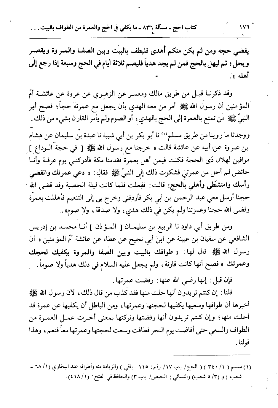 وَوَجَدْنَا مَا رُوِّينَا مِنْ طَرِيقِ مُسْلِمٍ نَا أَبُو بَكْرِ بْنُ أَبِي شَيْبَةَ نَا عَبْدَةُ بْنُ سُلَيْمَانَ عَنْ هِشَامِ بْنِ عُرْوَةَ عَنْ أَبِيهِ عَنْ عَائِشَةَ قَالَتْ «خَرَجْنَا مَعَ رَسُولِ اللَّهِ - صَلَّى اللَّهُ عَلَيْهِ وَسَلَّمَ - فِي حَجَّةِ الْوَدَاعِ مُوَافِينَ لِهِلَالِ ذِي الْحِجَّةِ فَكُنْتُ فِيمَنْ أَهَلَّ بِعُمْرَةٍ فَقَدِمْنَا مَكَّةَ فَأَدْرَكَنِي يَوْمُ عَرَفَةَ وَأَنَا حَائِضٌ لَمْ أَحِلَّ مِنْ عُمْرَتِي فَشَكَوْتُ ذَلِكَ إلَى النَّبِيِّ - صَلَّى اللَّهُ عَلَيْهِ وَسَلَّمَ - فَقَالَ: دَعِي عُمْرَتَكِ وَانْقُضِي رَأْسَكِ وَامْتَشِطِي وَأَهِلِّي بِالْحَجِّ قَالَتْ: فَفَعَلْتُ فَلَمَّا كَانَتْ لَيْلَةُ الْحَصْبَةِ وَقَدْ قَضَى اللَّهُ حَجَّنَا أَرْسَلَ مَعِي عَبْدَ الرَّحْمَنِ بْنَ أَبِي بَكْرٍ فَأَرْدَفَنِي، وَخَرَجَ بِي إلَى التَّنْعِيمِ فَأَهْلَلْتُ بِعُمْرَةٍ، وَقَضَى اللَّهُ حَجَّنَا وَعُمْرَتَنَا وَلَمْ يَكُنْ فِي ذَلِكَ هَدْيٌ، وَلَا صَدَقَةٌ، وَلَا صَوْمٌ» .