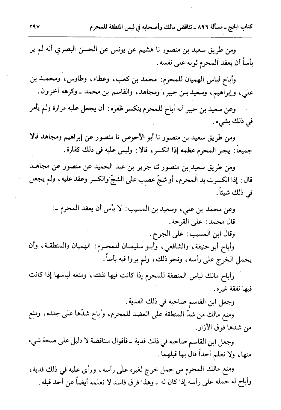 وَمِنْ طَرِيقِ سَعِيدِ بْنِ مَنْصُورٍ نَا هُشَيْمٌ عَنْ يُونُسَ عَنْ الْحَسَنِ الْبَصْرِيِّ أَنَّهُ لَمْ يَرَ بَأْسًا أَنْ يَعْقِدَ الْمُحْرِمُ ثَوْبَهُ عَلَى نَفْسِهِ.